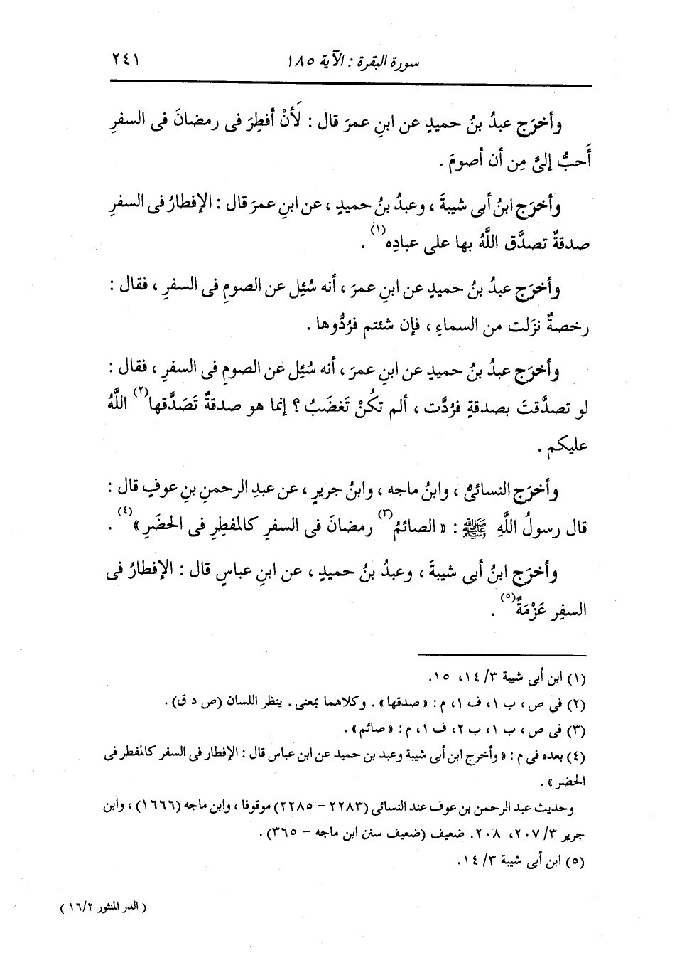 وأخرج ابن أبي شيبة وأبو داود والنسائي ، عَن جَابر بن عبد الله ، أن رسول الله صلى الله عليه وسلم قال ليس من البر الصيام في السفر.