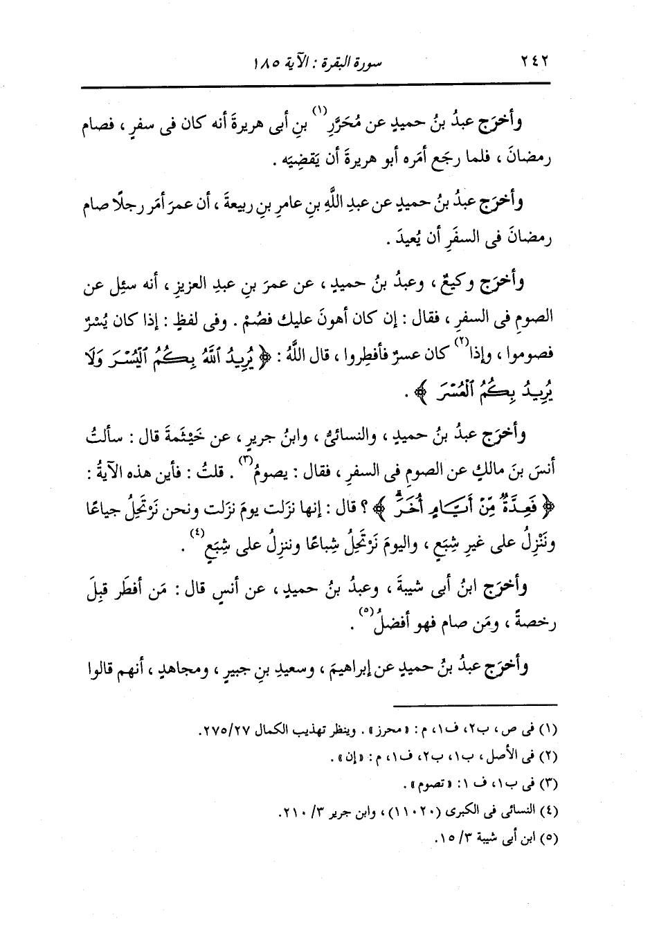 وأخرج النسائي ، وَابن ماجه ، وَابن جَرِير عن عبد الرحمن بن عوف قال : قال رسول الله صلى الله عليه وسلم صائم رمضان في السفر كالمفطر في الحضر.