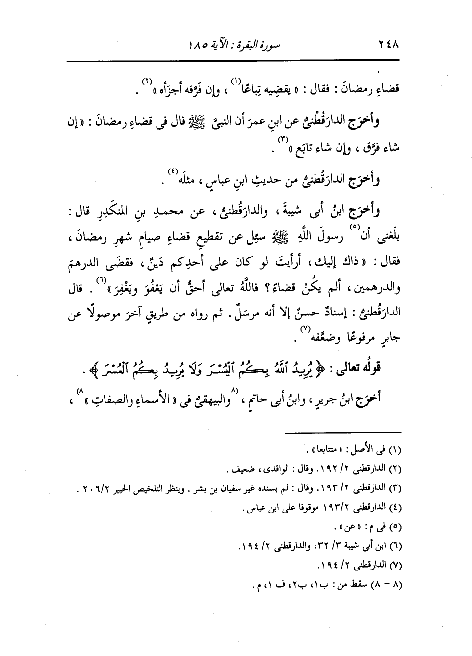 وأخرج ابن المنذر والدارقطني وصححه والبيهقي في "سُنَنِه" عن عائشة قالت : نزلت / {فعدة من أيام أخر متتابعات > / فسقطت متتابعات ، قال البيهقي : أي نسخت.