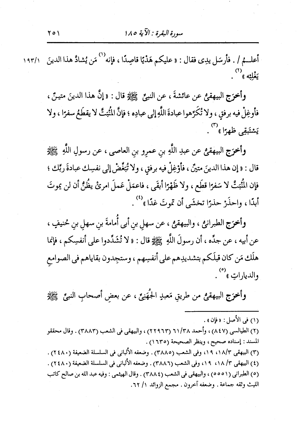 وأخرج البخاري والنسائي والبيهقي في شعب الإيمان عن أبي هريرة قال سمعت النَّبِيّ صلى الله عليه وسلم يقول : الدين يسر ولن يغالب الدين أحد إلا غلبه سددوا وقاربوا وأبشروا واستعينوا بالغدوة والروحة وشيء من الدلجة.