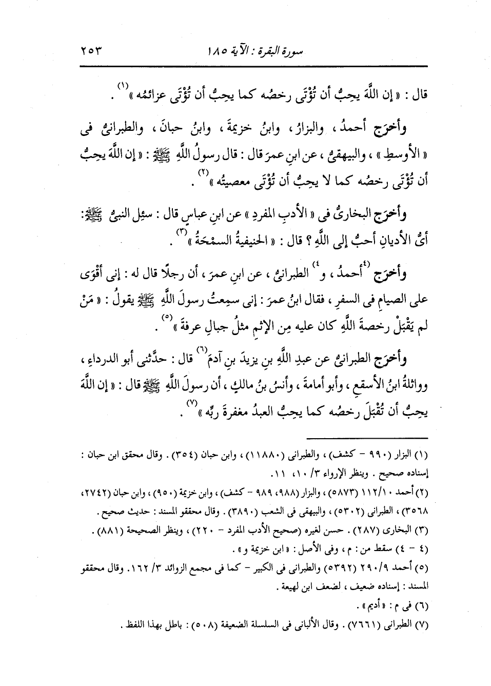 وأخرج أحمد والبزار ، وَابن خزيمة ، وَابن حبان والطبراني في الأوسط والبيهقي عن ابن عمر قال : قال رسول الله صلى الله عليه وسلم إن الله يحب أن تؤتى رخصه كما لا يحب أن تؤتى معصيته.