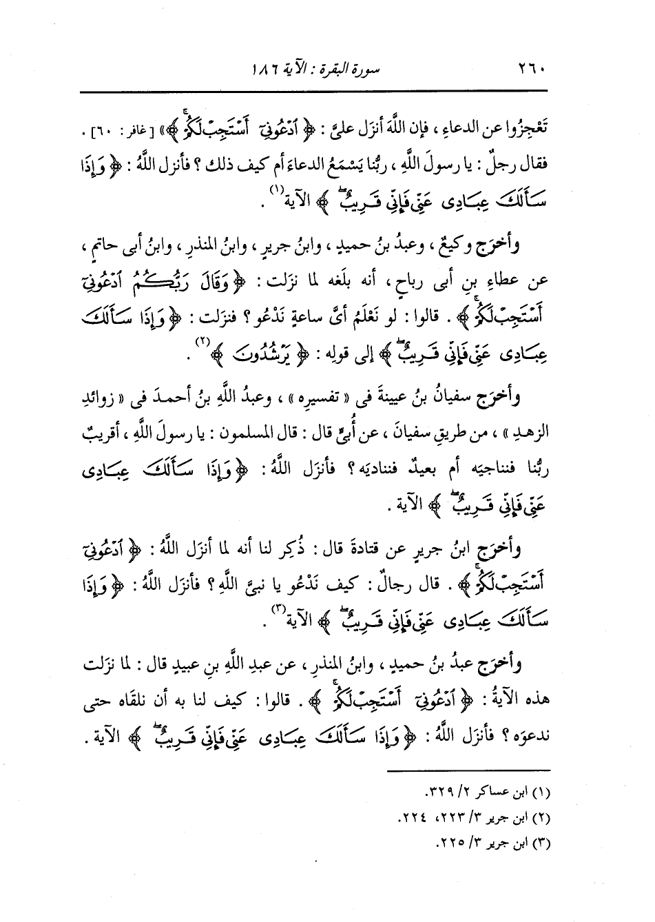 وأخرج وكيع ، وعَبد بن حُمَيد ، وَابن جَرِير ، وَابن المنذر ، وَابن أبي حاتم عن عطاء بن أبي رباح ، أنه بلغه لما أنزلت (وقال ربكم ادعوني أستجيب لكم) (غافر الآية 60) قالوا : لو نعلم أي ساعة ندعو فنزلت {وإذا سألك عبادي عني فإني قريب} إلى قوله {يرشدون}.