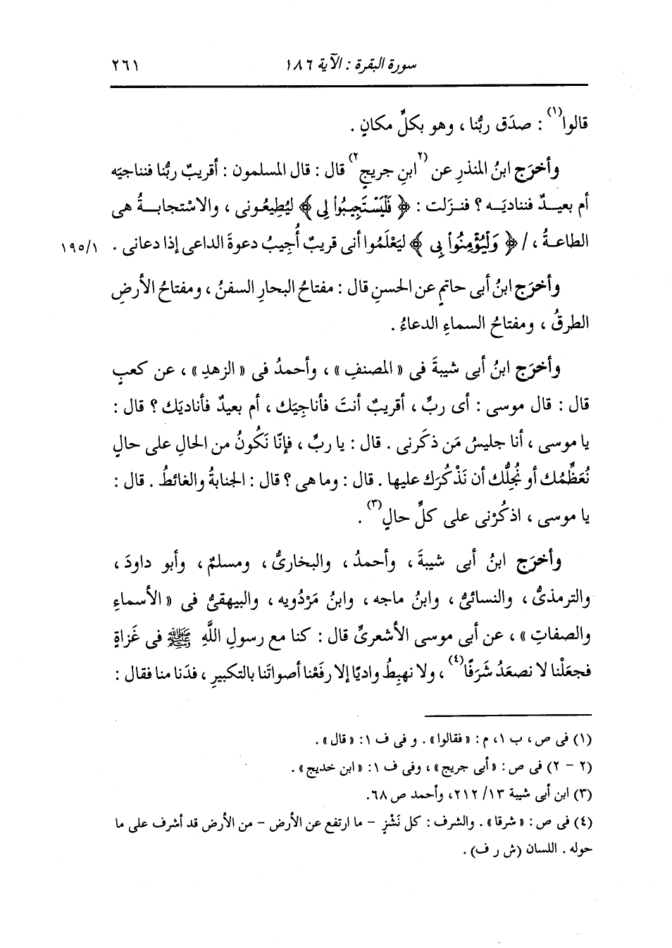 وأخرج ابن أبي شيبة وأحمد والبخاري ومسلم وأبو داود والترمذي والنسائي ، وَابن ماجه ، وَابن مردويه والبيهقي في الأسماء والصفات عن أبي موسى الأشعري قال كنا مع رسول الله صلى الله عليه وسلم في غزاة فجعلنا لا نصعد شرفا ولا نهبط واديا إلا رفعنا أصواتنا بالتكبير فدنا منا فقال :