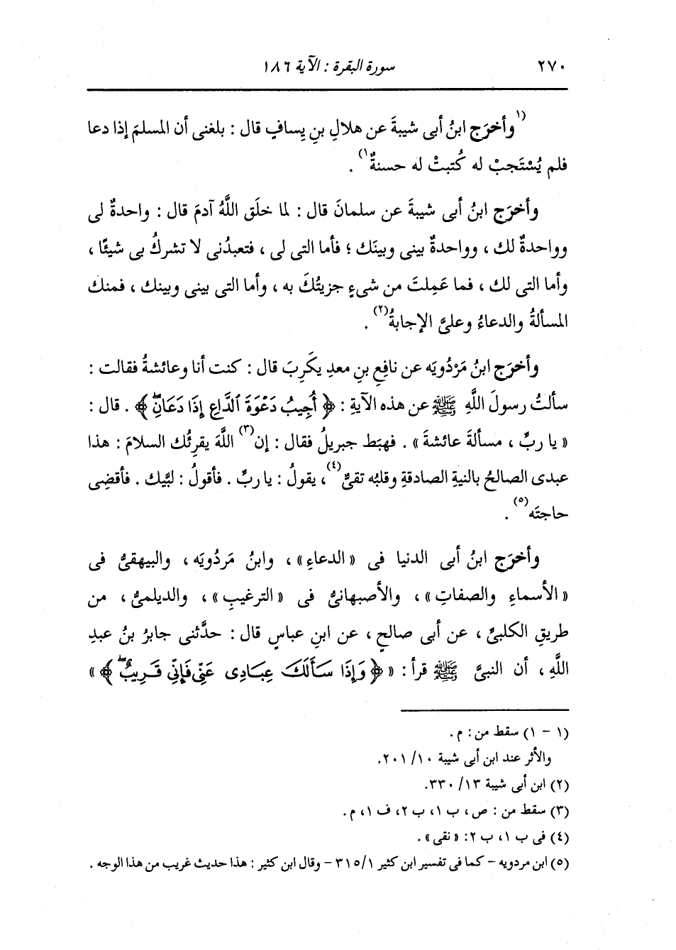 وأخرج ابن أبي الدنيا في الدعاء ، وَابن مردويه والبيهقي في الأسماء والصفات والأصبهاني في الترغيب والديلمي من طريق الكلبي عن أبي صالح عن ابن عباس قال : حدثني جابر بن عبد الله أن النَّبِيّ صلى الله عليه وسلم قرأ {وإذا سألك عبادي عني فإني قريب}