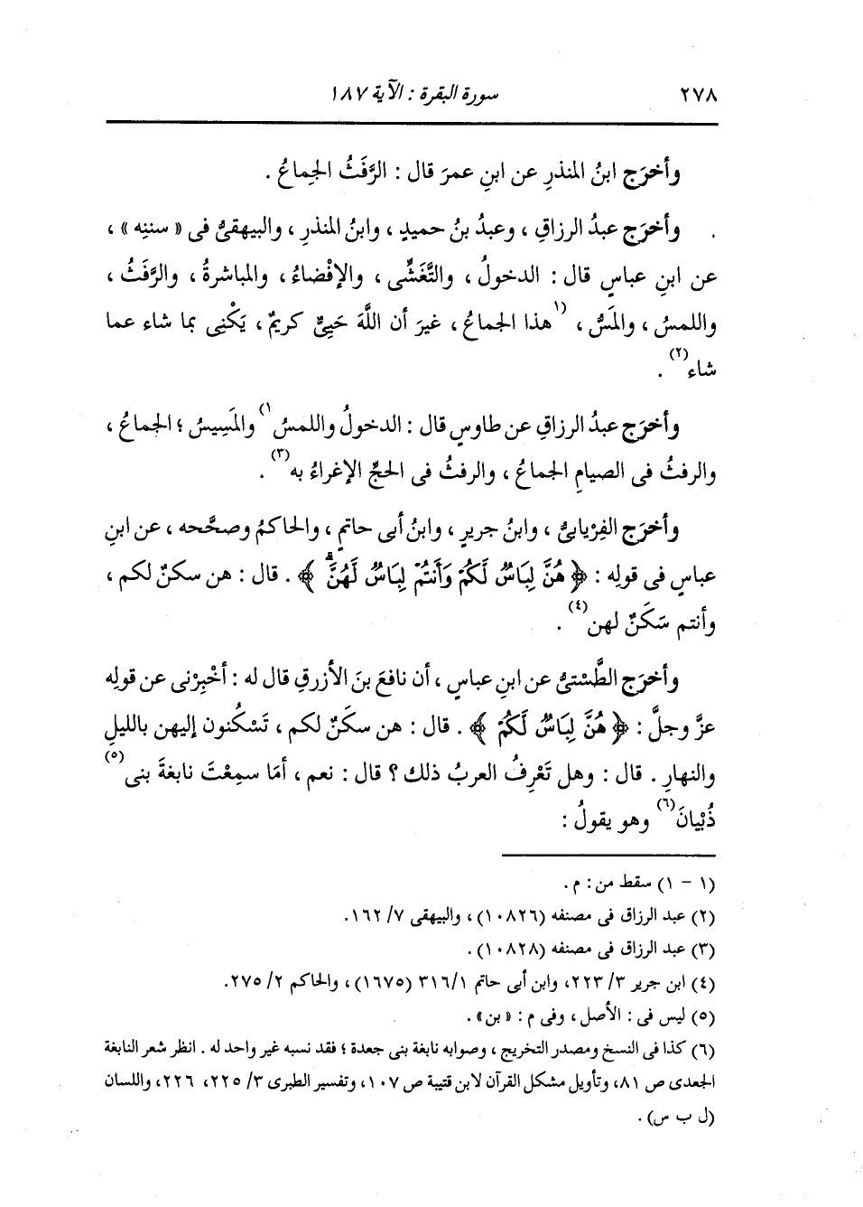 وأخرج عبد الرزاق ، وعَبد بن حُمَيد ، وَابن المنذر والبيهقي في "سُنَنِه" عن ابن عباس قال : الدخول والتغشي والإفضاء والمباشرة والرفث واللمس والمس والمسيس : الجماع والرفث في الصيام : الجماع والرفث في الحج : الإغراء به.