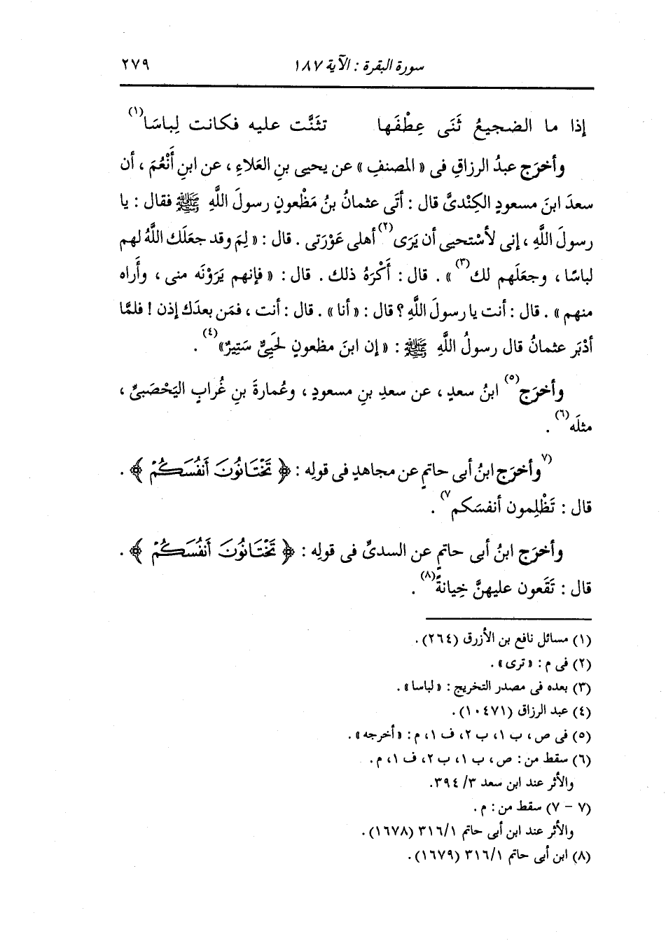 وَأخرَج عبد الرزاق في المصنف عن يحيى بن العلاء عن ابن أنعم أن سعد بن مسعود الكندي قال : أتى عثمان بن مظعون رسول الله صلى الله عليه وسلم فقال : يا رسول الله إني لأستحي أن ترى أهلي عورتي ، قال : لم وقد جعلك الله لهم لباسا وجعلهم لك قال : أكره ذلك ، قال : لإغنهم يرونه مني وأراه منهم ، قال : أنت يا رسول الله