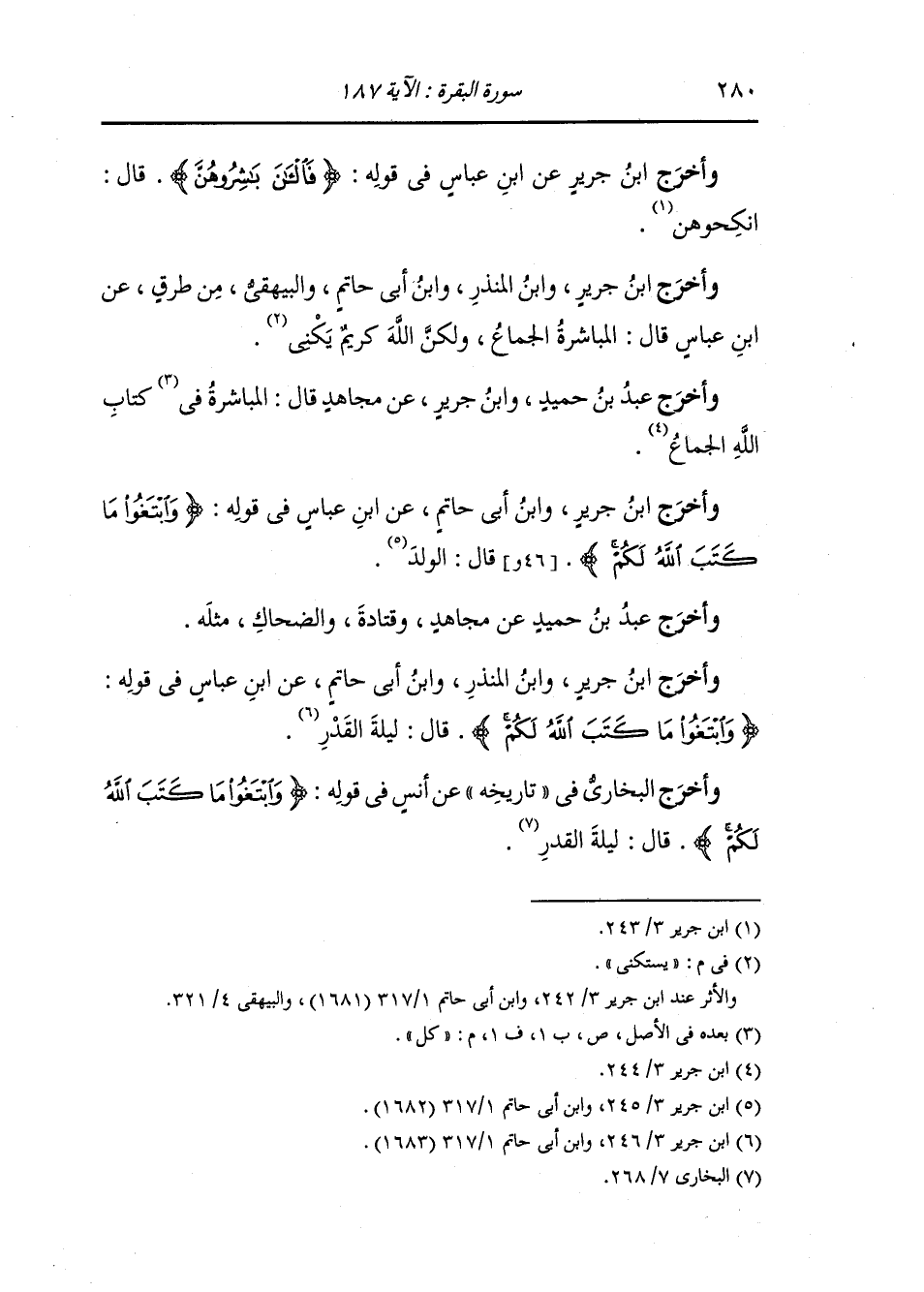 وأخرج ابن جرير ، وَابن المنذر ابن وأبي حاتم والبيهقي من طرق عن ابن عباس قال : المباشرة الجماع ولكن الله كريم يستكني.