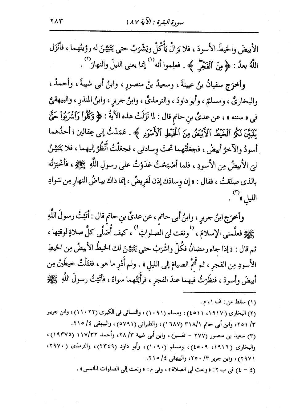 وأخرج ابن جرير ، وَابن أبي حاتم عن عدي بن حاتم قال أتيت رسول الله صلى الله عليه وسلم فعلمني الإسلام ونعت لي الصلوات الخمس كيف أصلي كل صلاة لوقتها ثم قال : إذا جاء رمضان فكل واشرب حتى يتبين لك الخيط الأبيض من الخيط