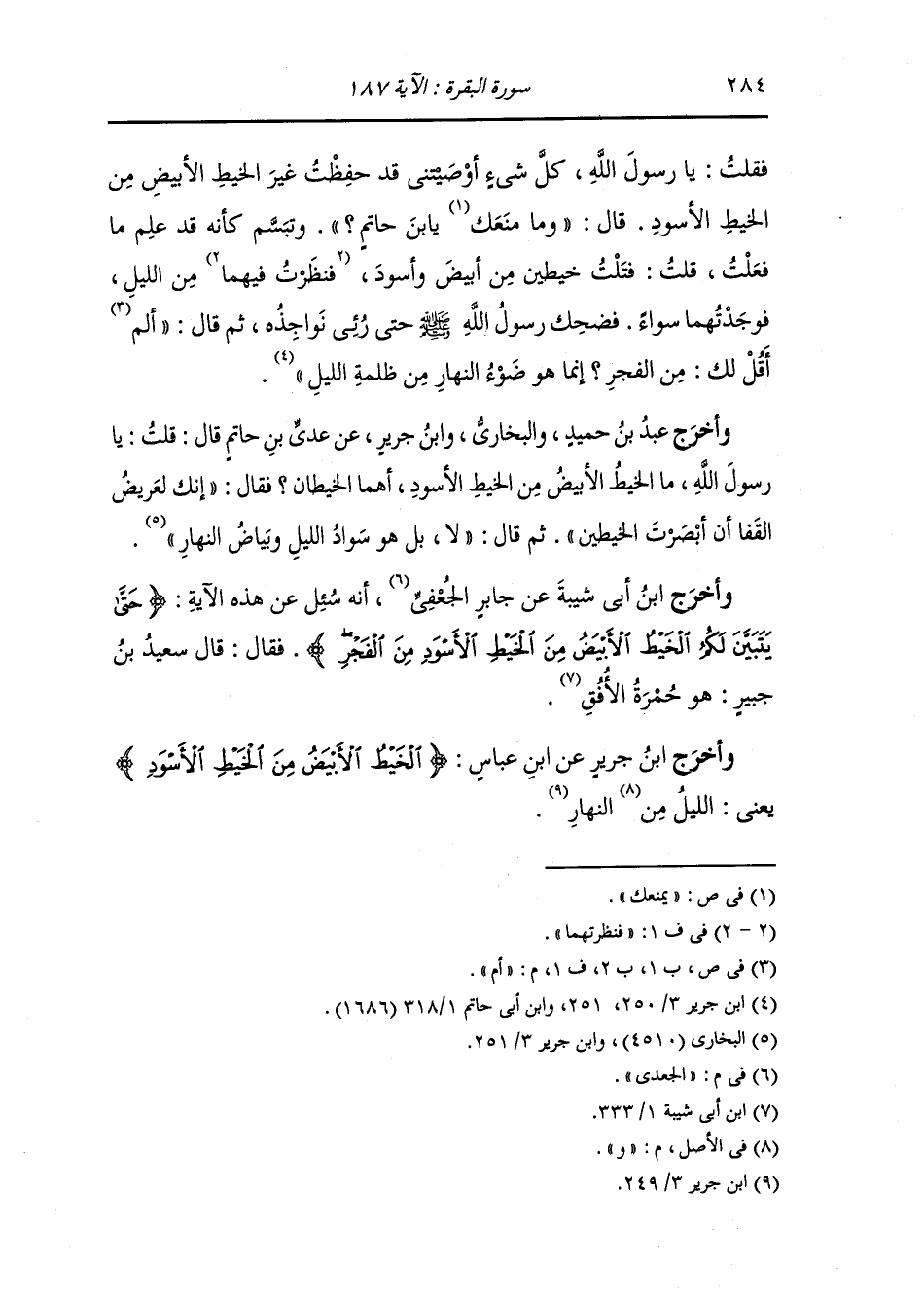 وأخرج عَبد بن حُمَيد والبخاري ، وَابن جَرِير عن عدي بن حاتم قال قلت يا رسول الله ما الخيط الأبيض من الخيط الأسود أهما الخيطان فقال : إنك لعريض القفا إن أبصرت الخيطين ثم قال : لا بل هو سواد الليل وبياض النهار.