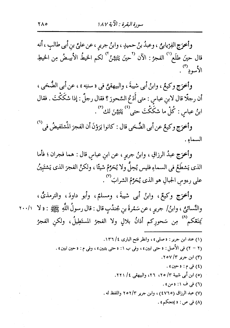 وأخرج عبد الرزاق ، وَابن جَرِير عن ابن عباس قال : هما فجران فأما الذي يسطع في السماء فليس يحل ولا يحرم شيئا ولكن الفجر الذي يستبين على رؤوس الجبال هو الذي يحرم الشراب.
