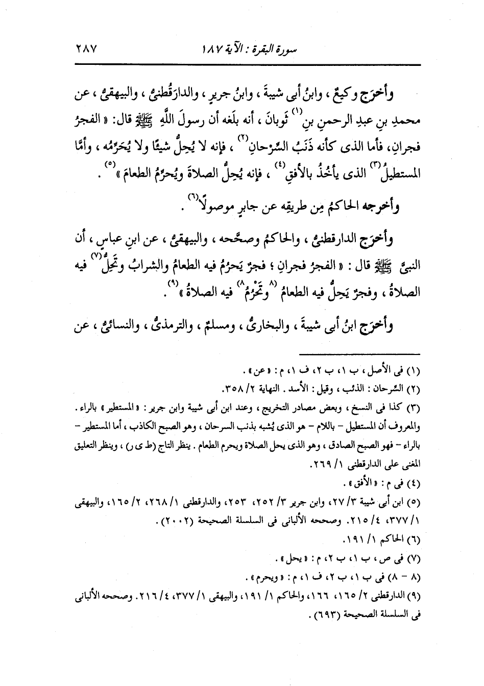 وأخرج الدارقطني والحاكم وصححه والبيهقي عن ابن عباس أن النَّبِيّ صلى الله عليه وسلم قال : الفجر فجران فجر يحرم فيه الطعام والشراب ويحل فيه الصلاة وفجر يحل فيه الطعام ويحرم فيه الصلاة.