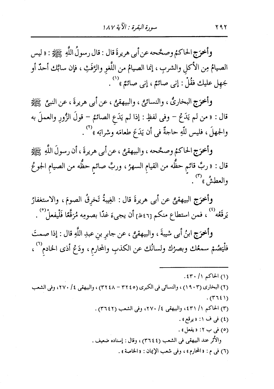وأخرج البخاري والنسائي والبيهقي عن أبي هريرة عن النَّبِيّ صلى الله عليه وسلم قال من لم يدع ، وفي لفظ : إذا لم يدع الصائم قول الزور والعمل به والجهل فليس لله حاجة في أن يدع طعامه وشرابه.