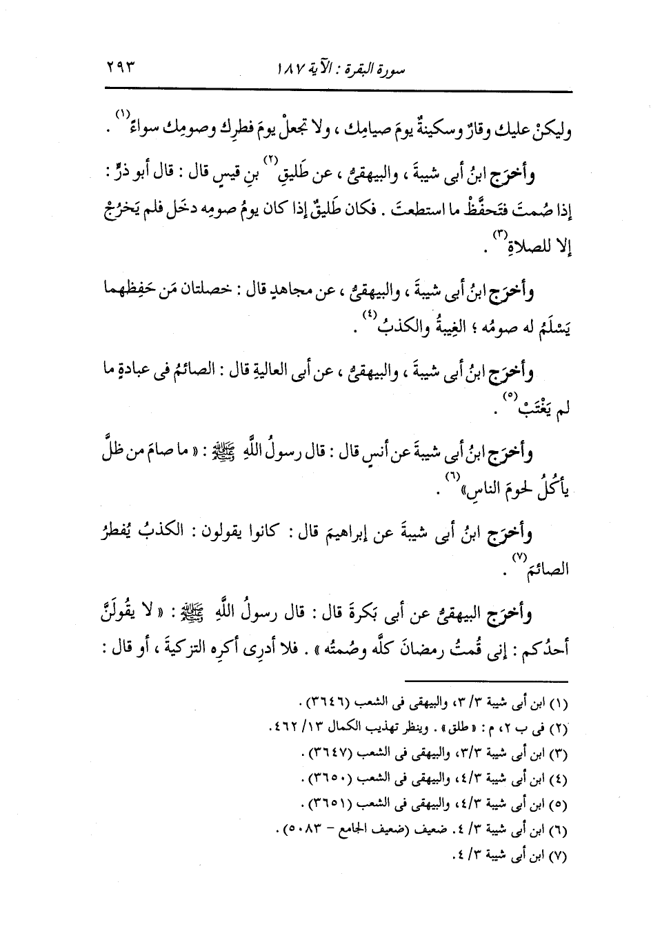 وأخرج ابن أبي شيبة والبيهقي عن طلق بن قيس قال : قال أبو ذر : إذا صمت فتحفظ ما استطعت فكان طلق إذا كان يوم صومه دخل فلم يخرج إلا للصلاة.