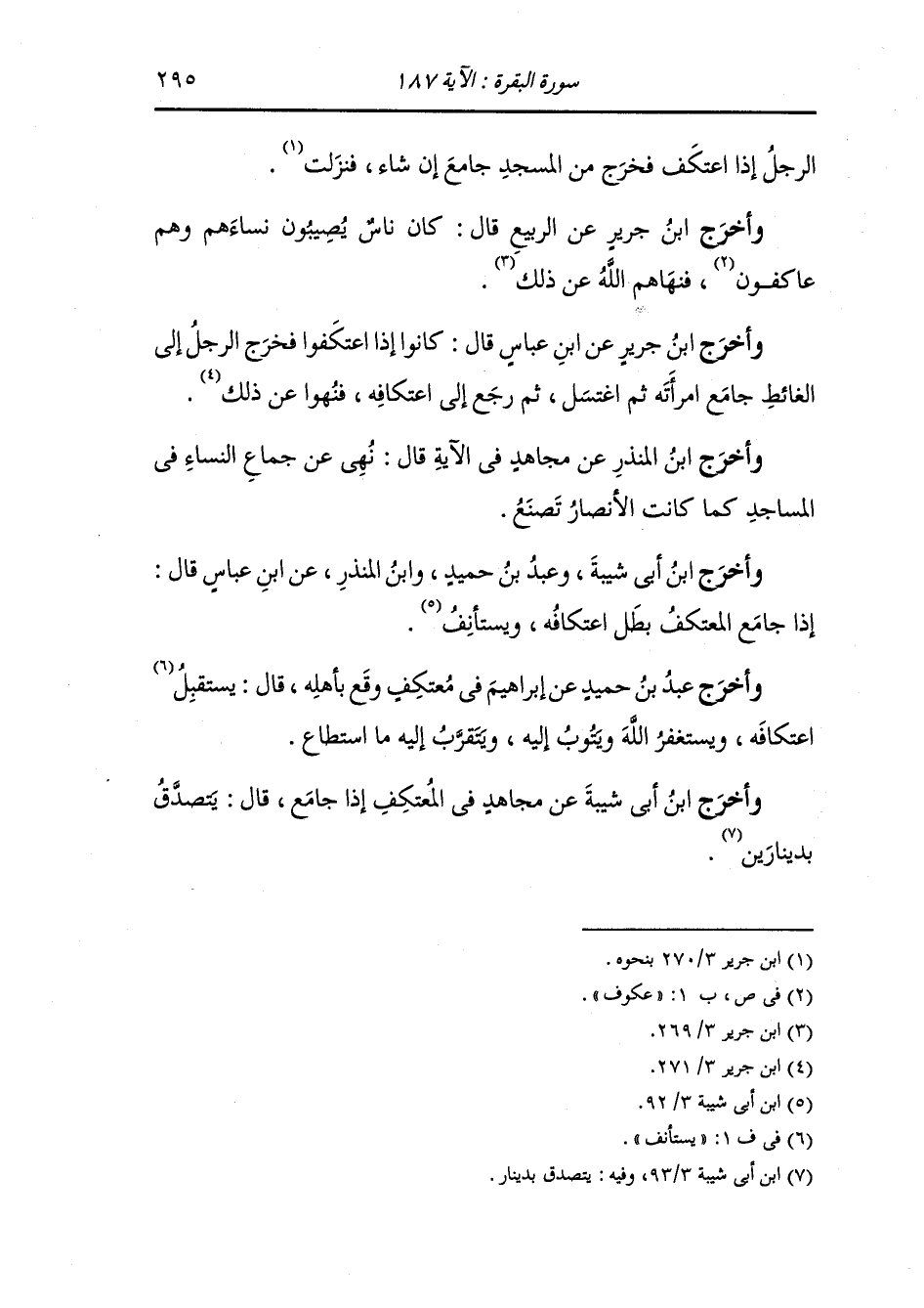 وأخرج ابن جرير عن الربيع قال : كان ناس يصيبون نساءهم وهم عاكفون فنهاهم الله عن ذلك.