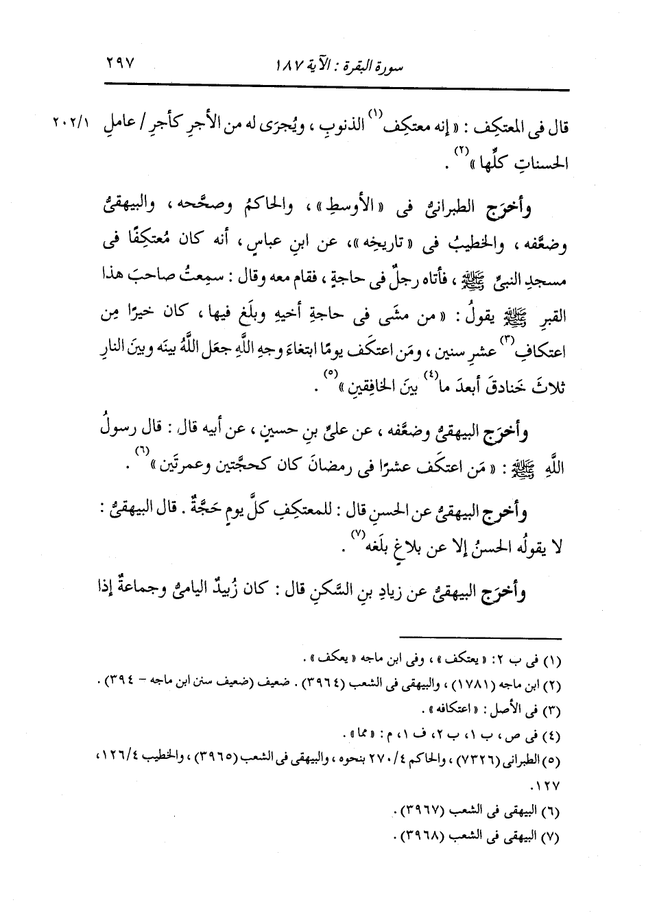 وأخرج الطبراني في الأوسط والحاكم وصححه والبيهقي وضعفه والخطيب في تاريخه عن ابن عباس أنه كان معتكفا في مسجد رسول الله صلى الله عليه وسلم فأتاه رجل في حاجة فقام معه وقال : سمعت صاحب هذا القبر يقول من مشى في حاجة أخيه وبلغ فيها كان خيرا من اعتكاف عشر سنين ومن اعتكف يوما ابتغاء وجه الله جعل الله بينه وبين النار ثلاث خنادق أبعد مما بين الخافقين.