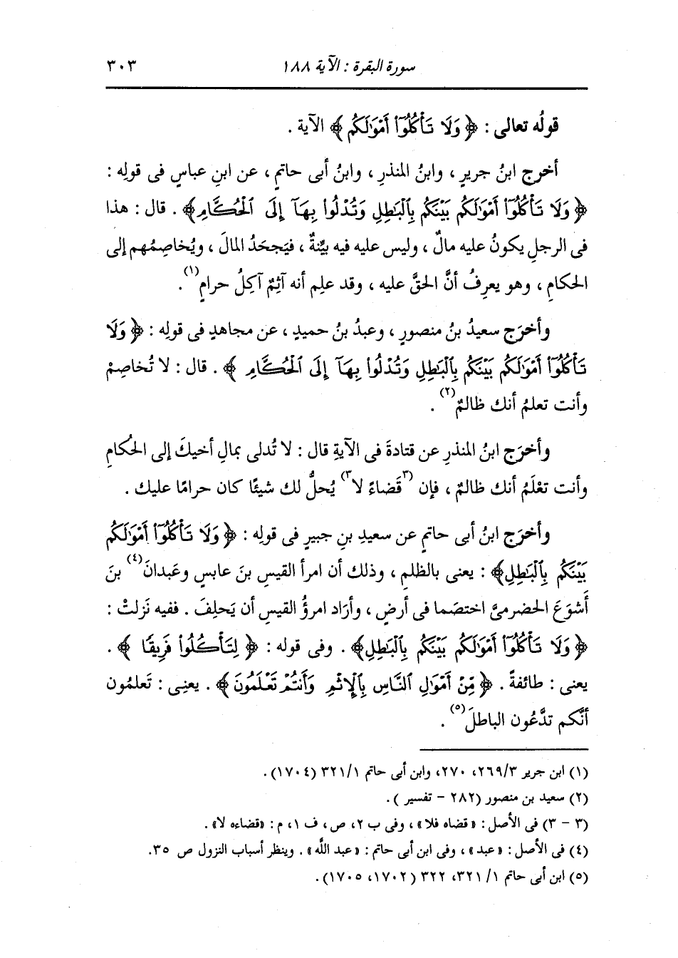 وأخرج ابن جرير ، وَابن المنذر ، وَابن أبي حاتم عن ابن عباس في قوله {ولا تأكلوا أموالكم بينكم بالباطل وتدلوا بها إلى الحكام} قال : هذا في الرجل يكون عليه مال وليس عليه فيه بينة فيجحد المال ويخاصمهم إلى الحكام وهو يعرف أن الحق عليه وقد علم أنه إثم أكل حرام.
