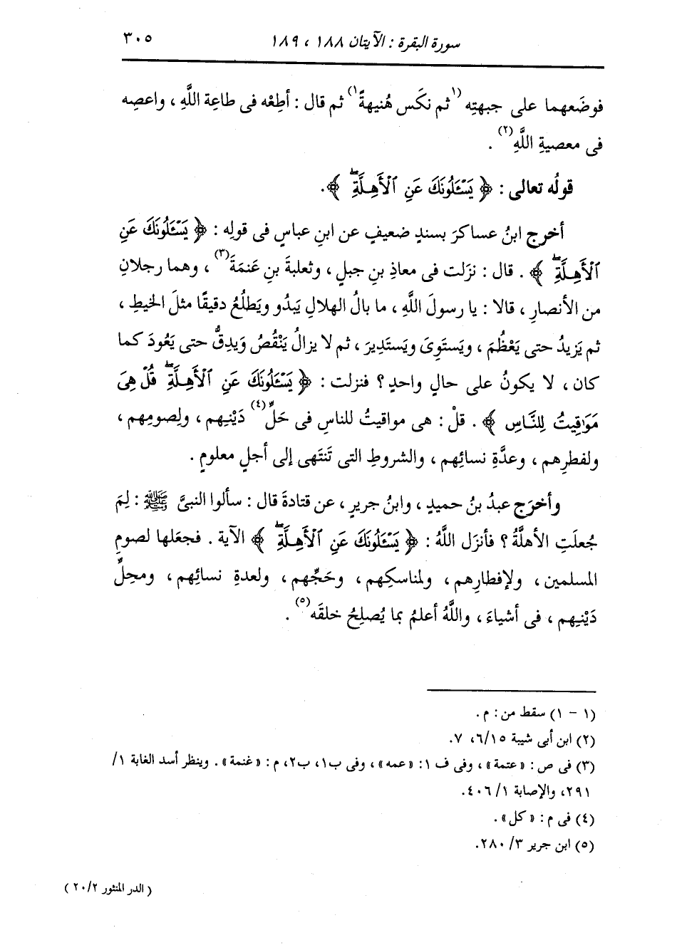 وأخرج عَبد بن حُمَيد ، وَابن جَرِير عن قتادة قال سألوا النَّبِيّ صلى الله عليه وسلم : لم جعلت الأهلة فأنزل الله {يسألونك عن الأهلة} الآية ، فجعلها لصوم المسلمين ولإفطارهم ولمناسكهم وحجهم ولعدة نسائهم ومحل دينهم في أشياء والله أعلم بما يصلح خلقه