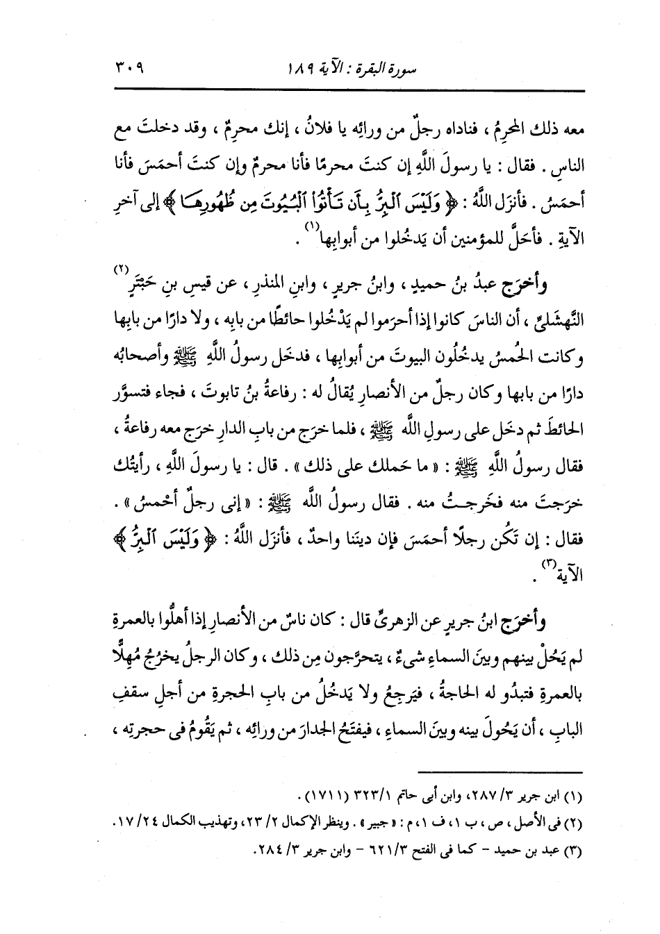 وأخرج عَبد بن حُمَيد ، وَابن جَرِير ، وَابن المنذر عن قيس بن جبير النهشلي أن الناس كانوا إذا أحرموا لم يدخلوا حائطا من بابه ولا دارا من بابها وكانت الحمس يدخلون البيوت من أبوابها فدخل رسول الله صلى الله عليه وسلم وأصحابه دارا وكان رجل من الأنصار يقال له رفاعة بن تابوت فتسور الحائط ثم دخل على رسول الله صلى الله عليه وسلم فلما خرج من باب الدار خرج معه رفاعة فقال رسول الله صلى الله عليه وسلم : ما حملك على ذلك قال : يا رسول الله رأيتك خرجت منه فخرجت منه ، فقال رسول الله صلى الله عليه وسلم : إني رجل أحمس ، فقال : إن تكن رجلا أحمس فإن ديننا واحد فأنزل الله {وليس البر} الآية.