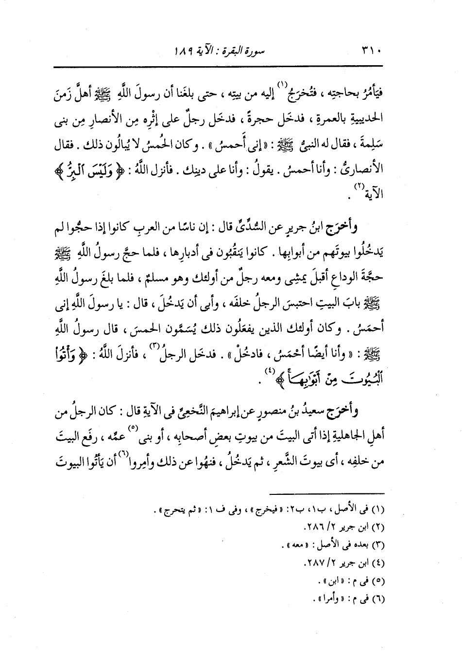 وأخرج ابن جرير عن السدي قال أن نايا من العرب كانوا إذا حجوا لم يدخلوا بيوتهم من أبوابها كانوا ينقبون في أدبارها فلما حج رسول الله صلى الله عليه وسلم حجة الوادع أقبل يمشي ومعه رجل من أولئك وهو مسلم فلما بلغ رسول الله صلى الله عليه وسلم باب البيت احتبس الرجل خلفه وأبى أن يدخل ، قال : يا رسول الله إني أحمس ، وكان أولئك الذين يفعلون ذلك يسمون الحمس قال رسول الله صلى الله عليه وسلم : وأنا أيضا أحمس فادخل فدخل الرجل فأنزل الله {وأتوا البيوت من أبوابها}.