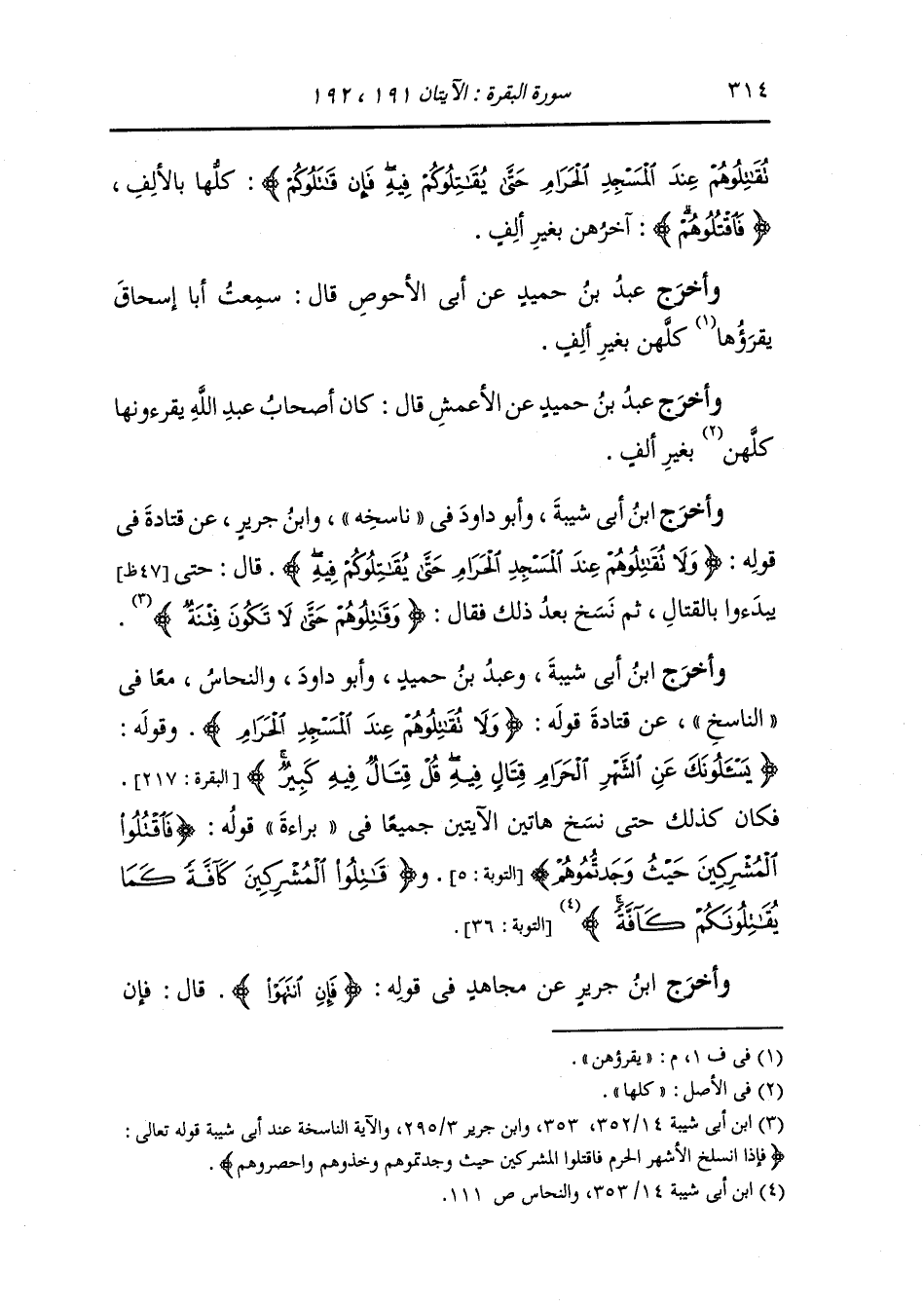 وَأخرَج ابن أبي شيبة ، وعَبد بن حُمَيد وأبو داود والنحاس معا في الناسخ عن قتادة في قوله {ولا تقاتلوهم عند المسجد الحرام} وقوله (يسألونك عن الشهر الحرام قتال فيه قل قتال فيه كبير) (البقرة الآية 217) فكان كذلك حتى نسخ هاتين الآيتين جميعا في براءة قوله (فاقتلوا المشركين حيث وجدتموهم) (التوبة الآية 5) ، (وقاتلوا المشركين كافة كما يقاتلونكم كافة) (التوبة الآية 36).