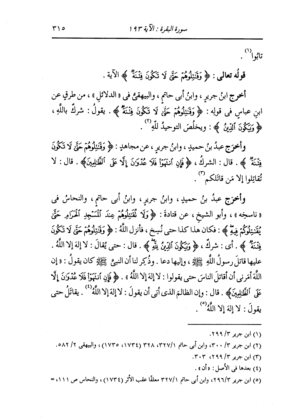 وأخرج عَبد بن حُمَيد ، وَابن جَرِير ، وَابن أبي حاتم والنحاس في ناسخه وأبو الشيخ عن قتادة ولا تقاتلوهم عند المسجد الحرام حتى يقاتلوكم فيه فكان هذا كذا حتى نسخ فأنزل الله {وقاتلوهم حتى لا تكون فتنة} أي شرك {ويكون الدين لله} قال : حتى يقال : لا إله إلا الله عليها قاتل رسول الله صلى الله عليه وسلم وإليها دعا ، وذكر لنا أن النَّبِيّ صلى الله عليه وسلم كان يقول إن الله أمرني أن أقاتل الناس حتى يقولوا : لا إلأه إلا الله {فإن انتهوا فلا عدوان إلا على الظالمين} قال : وإن الظالم الذي أبى أن يقول : لا إله إلا الله يقاتل حتى يقول : لا إله إلا الله