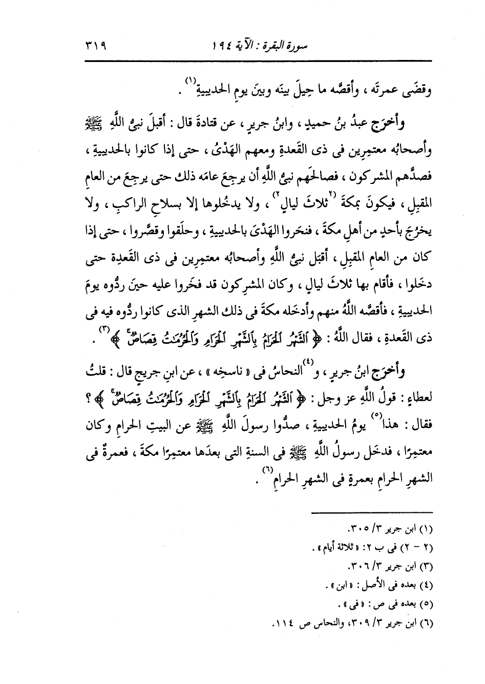 وأخرج ابن جرير والنحاس في ناسخه عن ابن جريج قال قلت لعطاء : قول الله عز وجل {الشهر الحرام بالشهر الحرام والحرمات قصاص} فقال : هذا يوم الحديبية صدوا رسول الله صلى اللهعليه وسلم عن البيت الحرام وكان معتمرا فدخل رسول الله صلى الله عليه وسلم في السنة التي بعدها معتمرا مكة فعمرة في الشهر الحرام بعمره في الشهر الحرام