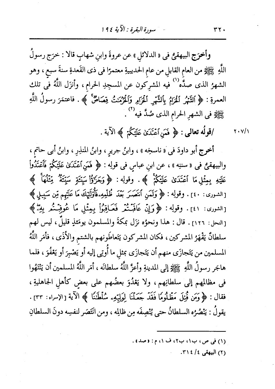 وأخرج أبو داود في ناسخه ، وَابن جَرِير ، وَابن المنذر ، وَابن أبي حاتم والبيهقي في "سُنَنِه" عن ابن عباس في قوله {فمن اعتدى عليكم فاعتدوا عليه بمثل ما اعتدى عليكم} وقوله {وجزاء سيئة سيئة مثلها} الشورى الآية 40 وقوله (ولمن انتصر بعد ظلمه فأولئك ما عليهم من سبيل) (الشورى الآية 41) وقوله (وإن عاقبتم فعاقبوا بمثل ما عوقبتم به) (النحل الآية 126) قال : هذا ونحوه نزل بمكة والمسلمون يومئذ قليل فليس لهم سلطان يقهر المشركين فكان المشركون يتعاطونهم بالشتم والأذى فأمر الله المسلمين من يتجازى منهم أن يتجازى بمثل ما أوتي إليه أو يصبر أو يعفو فلما هاجر رسول الله صلى الله عليه وسلم إلى المدينة وأعز الله سلطانه أمر الله المسلمين أن ينتهوا في مظالهم إلى سلطانهم ولا يعدو بعضهم على بعض كأهل الجاهلية فقال (ومن قتل مظلوما فقد جعلنا لوليه سلطانا) (الإسراء الآية 33) الآية ، يقول : ينصره السلطان حتى ينصفه من ظالمه ومن انتصر لنفسه دون السلطان