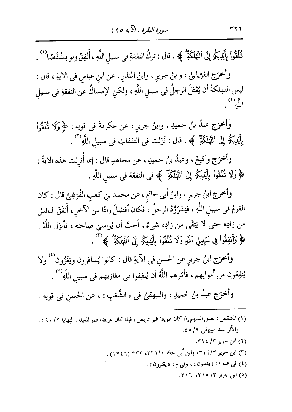 وأخرج ابن جرير ، وَابن أبي حاتم عن محمد بن كعب القرظي قال : كان القوم في سبيل الله فيتزود الرجل فكان أفضل زادا من الآخر أنفق اليابس من زاده حتى لا يبقى من زاده شيء أحب أن يواسي صاحبه فأنزل الله {وأنفقوا في سبيل الله ولا تلقوا بأيديكم إلى التهلكة}.