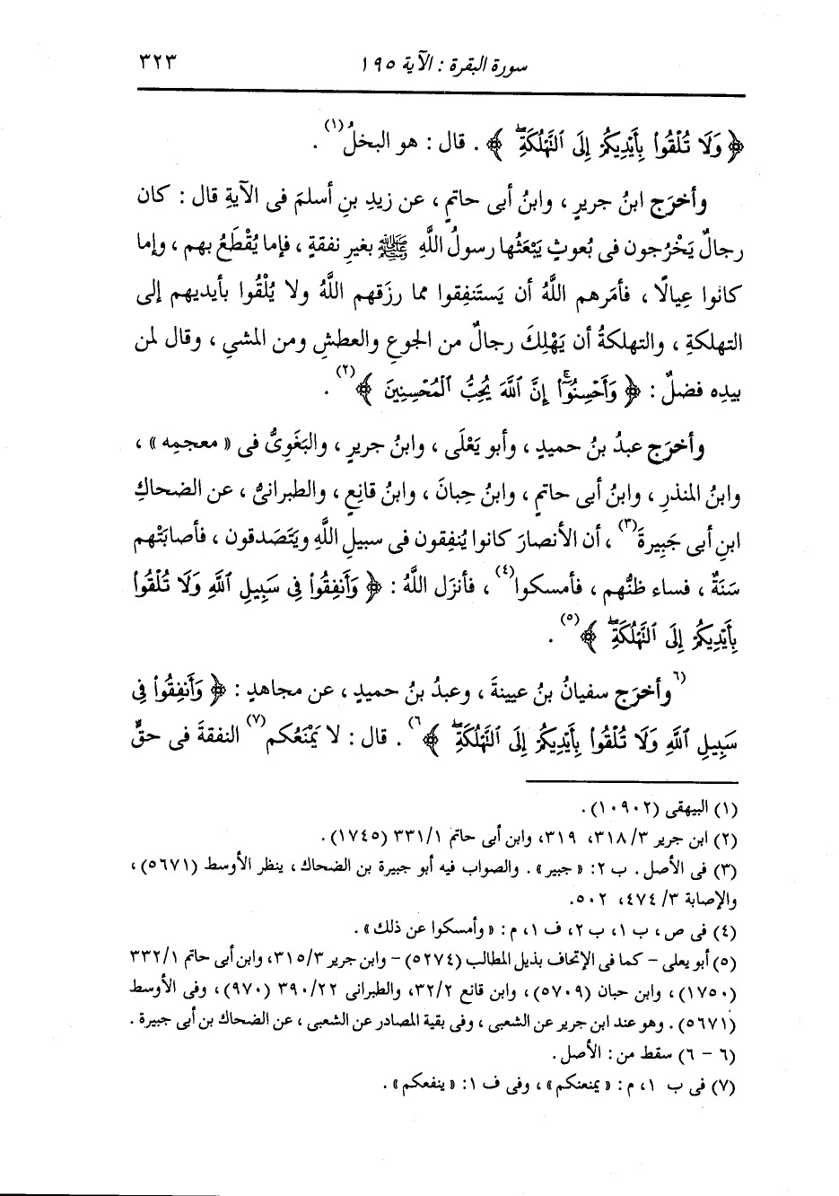 وأخرج سفيان بن عينية ، وعَبد بن حُمَيد عن مجاهد {وأنفقوا في سبيل الله ولا تلقوا بأيديكم إلى التهلكة} قال : لا يمنعنكم النفقة في حق