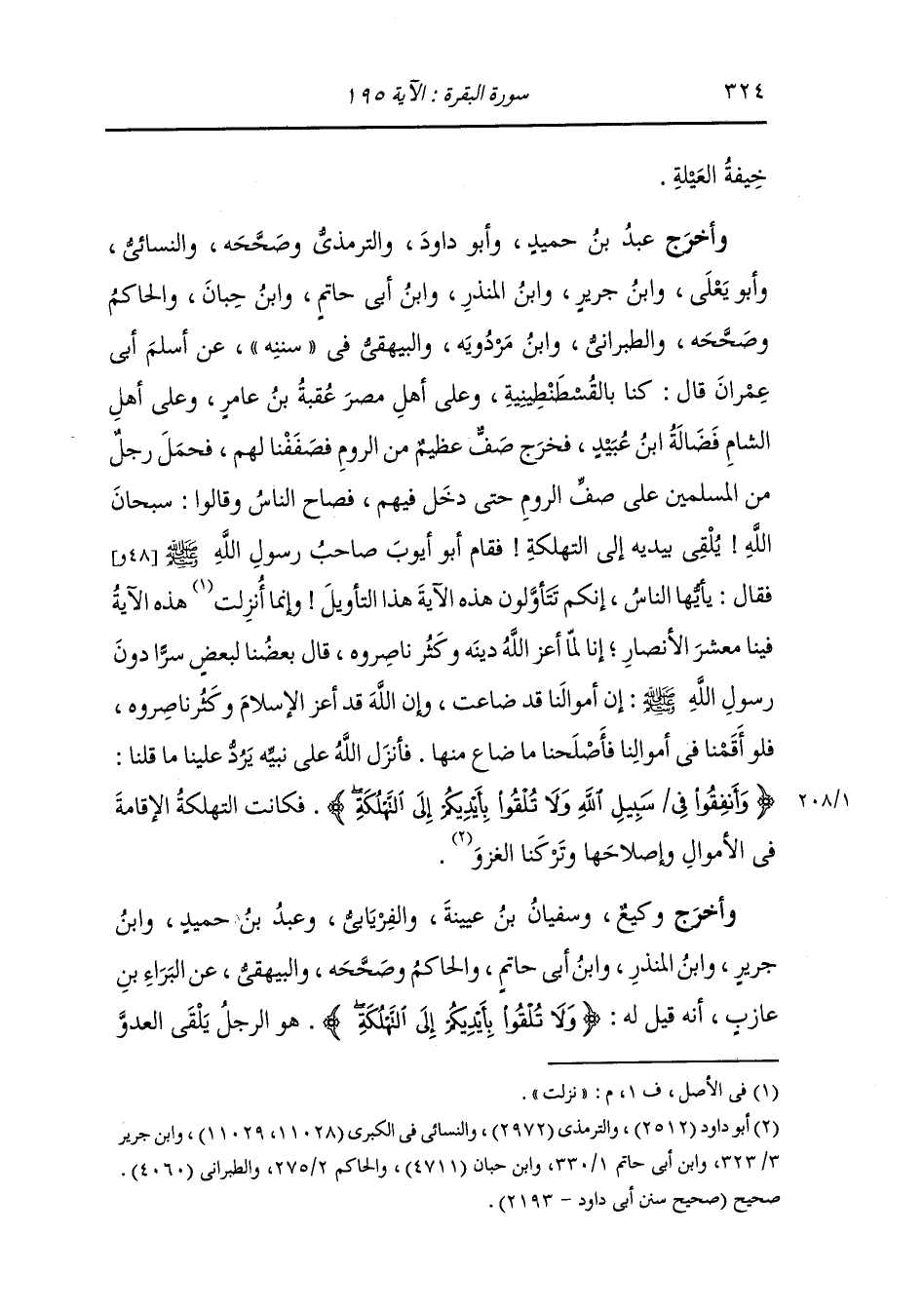 وأخرج عَبد بن حُمَيد وأبو داود والترمذي وصححه والنسائي وأبو يعلى ، وَابن جَرِير ، وَابن المنذر ، وَابن أبي حاتم ، وَابن حبان والحاكم وصححه والطبراني ، وَابن مردويه والبيهقي في "سُنَنِه" عن أسلم أبي عمران قال : كنا بالقسطنطينية وعلى أهل مصر عقبة بن عامر وعلى أهل الشام فضالة بن عبيد فخرج صف عظيم من الروم فصففنا لهم فحمل رجل من المسلمين على صف الروم حتى دخل فيهم فصاح الناس وقالوا : سبحان الله يلقي بيديه إلى التهلكة فقام أبو أيوب صاحب رسول الله صلى الله عليه وسلم فقال : يا أيها الناس إنكم تتأولون هذه الآية هذا التأويل وإنما نزلت هذه الآية فينا معشر الأنصار إنا لما أعز الله دينه وكثر ناصروه قال بعضنا لبعض سرا دون رسول الله صلى الله عليه وسلم : إن أموالنا قد ضاعت وإن الله قد أعز الإسلام وكثر ناصروه فلو أقمنا في أموالنا فأصلحنا ما ضاع فيها فأنزل الله على نبيه يرد علينا ما قلنا {وأنفقوا في سبيل الله ولا تلقوا بأيديكم إلى التهلكة} فكانت التهلكة الإقامة في الأموال وإصلاحها وتركنا الغزو.