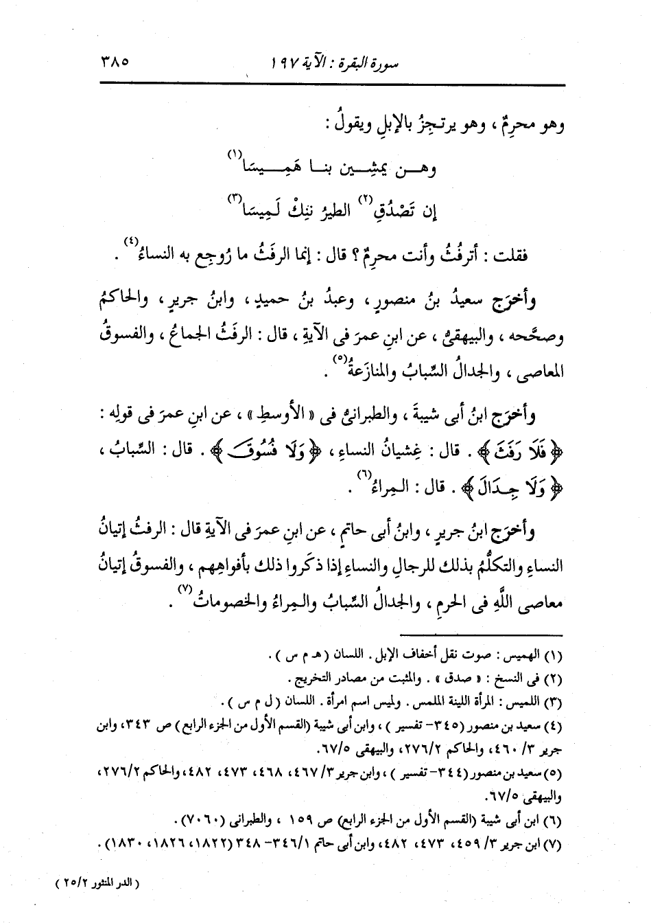 وأخرج ابن جرير ، وَابن أبي حاتم عن ابن عمر في الآية فقال : الرفث إتيان النساء والتكلم بذلك للرجال والنساء إذا ذكروا ذلك بأفواههم والفسوق إتيان معاصي الله في الحرم والجدال السباب والمراء الخصومات