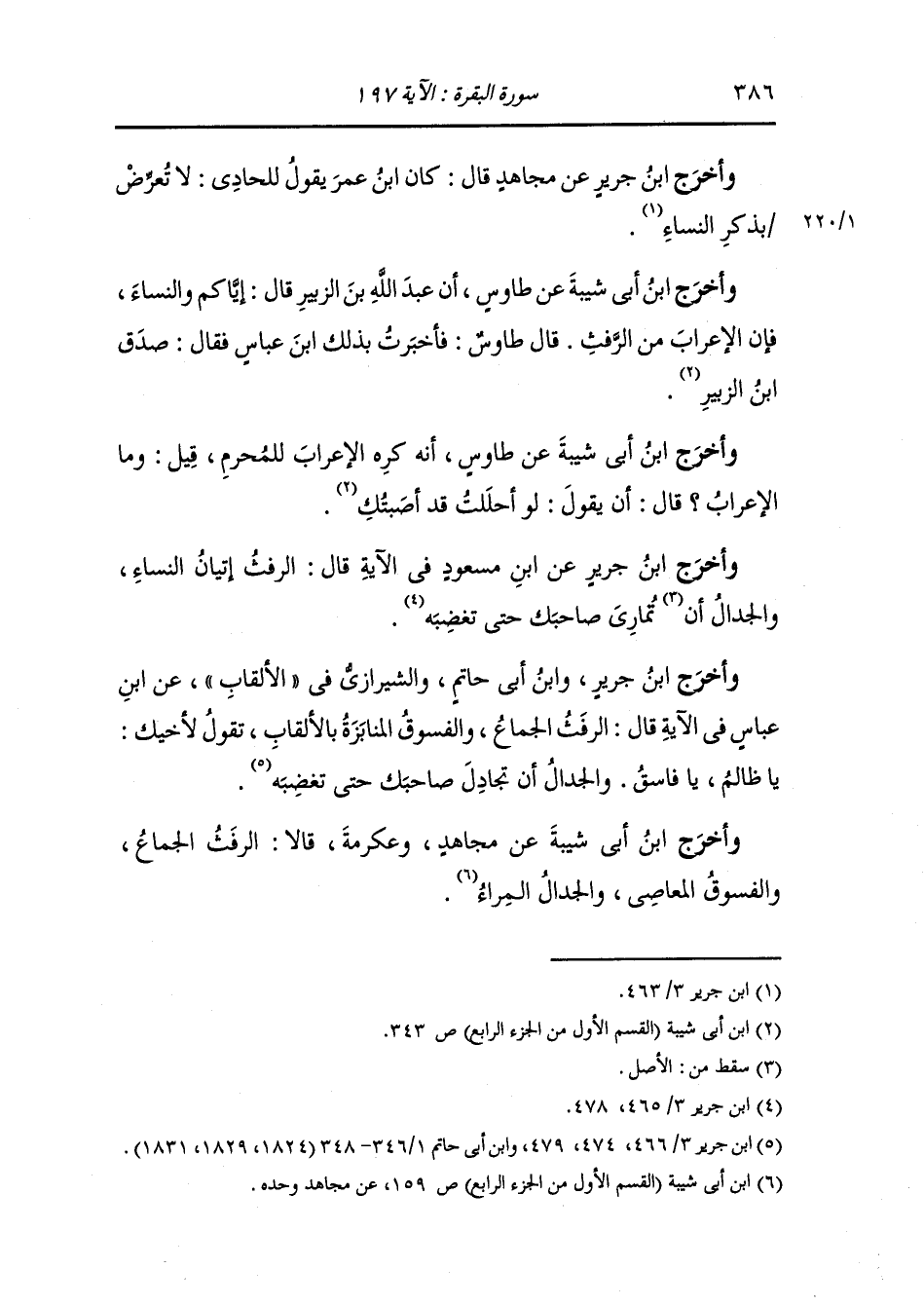 وأخرج ابن أبي شيبة ، عَن طاووس أن عبد الله بن الزبير قال : إياكم والنساء فإن الإعراب من الرفث ، قال طاووس : وأخبرت بذلك ابن عباس فقال : صدث ابن الزبير.
