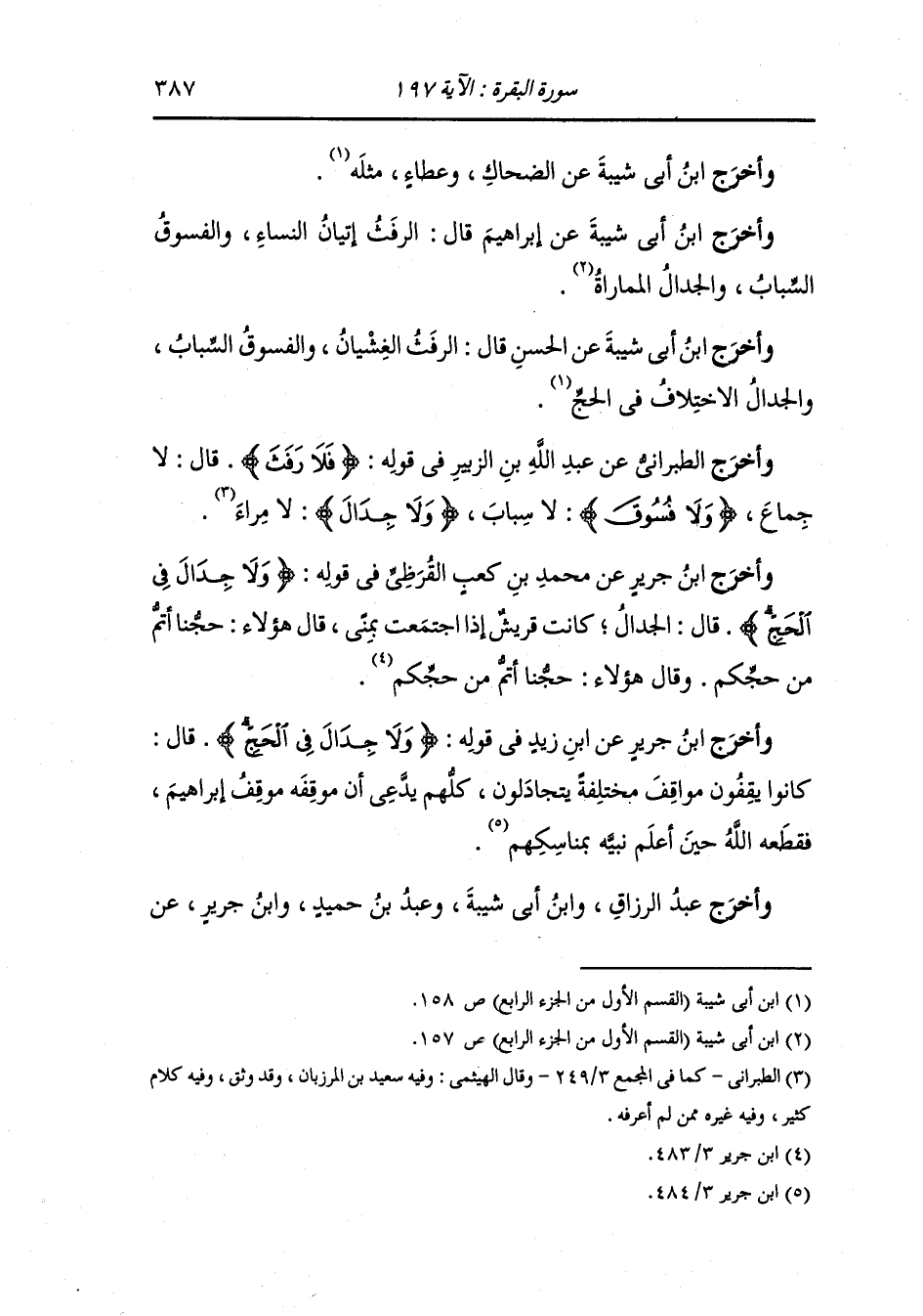وأخرج ابن جرير عن محمد بن كعب القرظي في قوله {ولا جدال في الحج} قال : الجدال كانت قريش إذا اجتمعت بمنى قال هؤلاء : حجنا أتم من حجكم ، وقال هؤلاء : حجنا أتم من حجكم.
