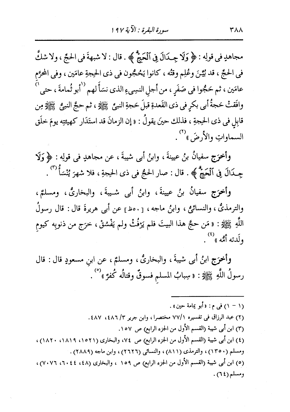 مجاهد في قوله {ولا جدال في الحج} قال : لا شبهة في الحج ولا شك في الحج قد بين وعلم وقته كانوا يحجون في ذي الحجة عامين وفي المحرم عامين ثم حجوا في صفر من أجل النسيء الذي نسأ لهم أبو يمامة حين وفقت حجة أبي بكر في ذي القعدة قبل حجة النَّبِيّ صلى الله عليه وسلم ثم حج النَّبِيّ صلى الله عليه وسلم من قابل في ذي الحجة فذلك حين يقول : إن الزمان قد استدار كهيئته يوم خلق السموات والأرض.