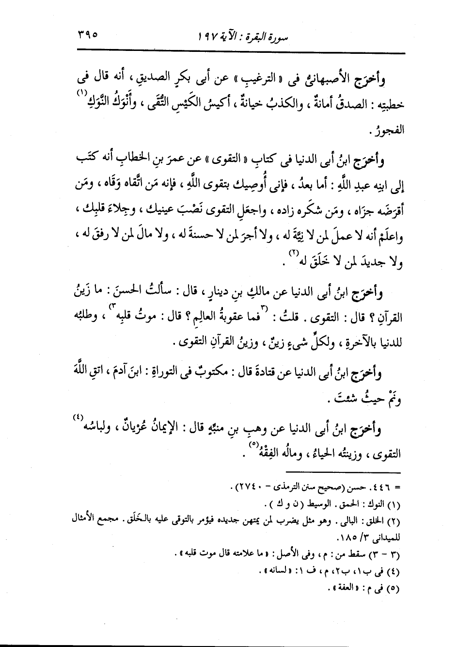 وأخرج ابن أبي الدنيا عن مالك بن دينار قال : سألت الحسن ما زين القرآن قال : التقوى.