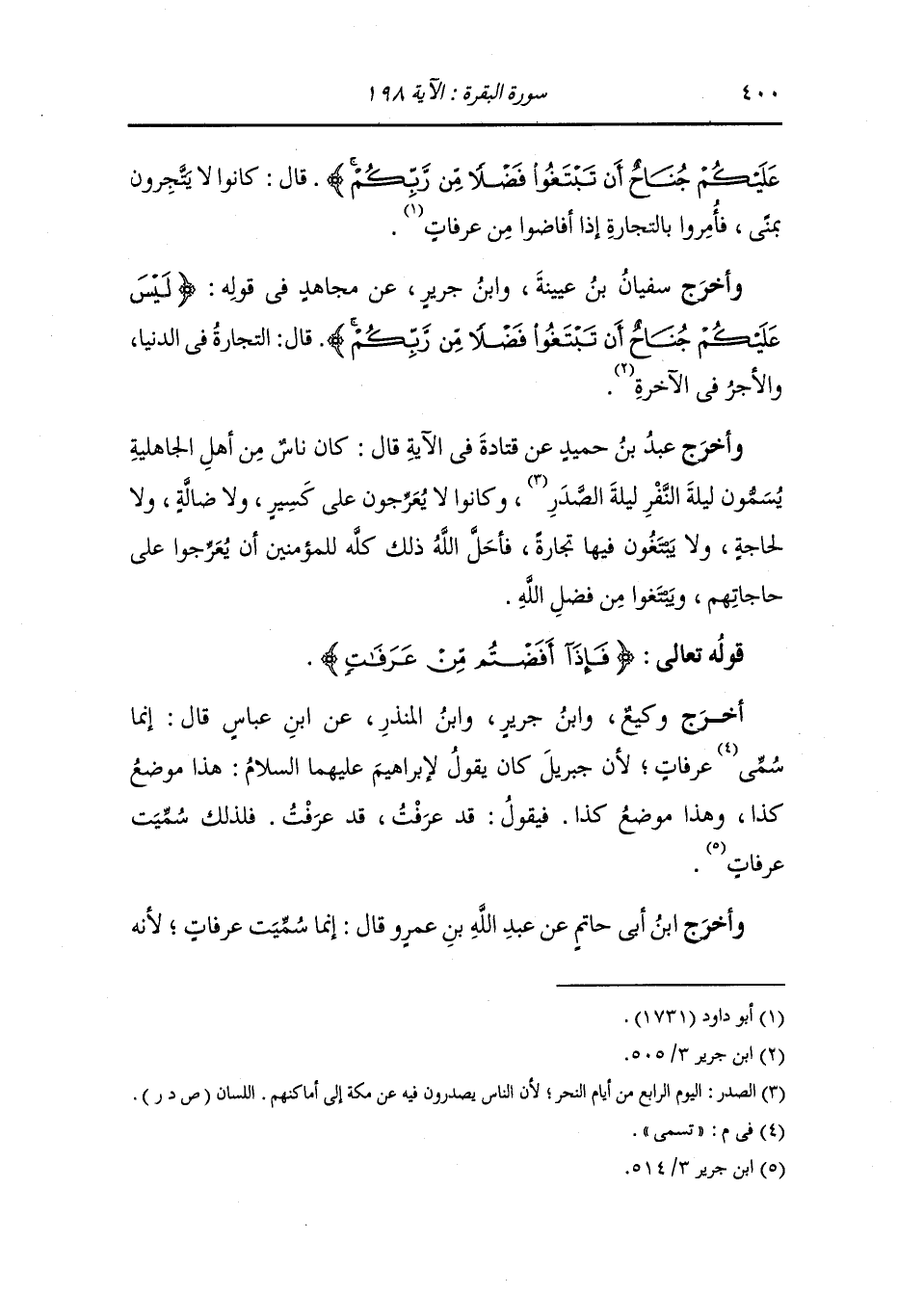 وأخرج عَبد بن حُمَيد عن قتادة في الآية قال : كان ناس من أهل الجاهلية يسمون ليلة النفر ليلة الصدر وكانوا لا يعرجون على كسير ولا ضالة ولا لحاجة ولا يتبغون فيها تجارة فأحل الله ذلك كله للمؤمنين أن يعرجوا على حاجاتهم ويبتغوا من فضل الله ، أما قوله تعالى : {فإذا أفضتم من عرفات}.
