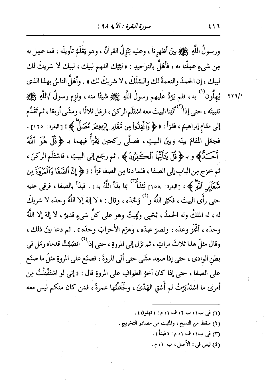 عملنا به فأهل التوحيد لبيك اللهم لبيك لبيك لا شريك لك لبيك إن الحمد والنعمة لك والملك لا شريك لك وأهل الناس بهذا الذي تهلون به فلم يرد عليهم رسول الله صلى الله عليه وسلم شيئا منه ، ولزم رسول الله صلى الله عليه وسلم تلبيته حتى أتينا البيت معه استلم الركن فرمل ثلاثا ومشى أربعا ثم تقدم إلى مقام إبراهيم فقرأ {واتخذوا من مقام إبراهيم مصلى} فجعل المقام بينه وبين البيت فصلى ركعتين يقرأ فيهما بقل هو الله أحد وبقل يا أيها الكافرون ثم رجع إلى البيت فاستلم الركن ثم خرج من الباب إلى الصفا فلما دنا من الصفا قرأ (إن الصفا والمروة من شعائر الله) (البقرة الآية 158) فبدأ بما بدأ الله به فبدأ بالصفا فرقى عليه حتى رأى البيت فكبر الله وحده وقال : لا إله إلا الله وحده لا شريك له له الملك وله الحمد يحي ويميت وهو على كل شيء قدير لا إله إلا الله وحده أنجز وعده ونصر عبده وهزم الأحزاب وحده ثم دعا بين ذلك وقال : مثل هذا ثلاث مرات ، ثم نزل إلى المروة حتى انصبت قدماه رمل في بطن الوادي حتى إذا صعد مشى حتى أتى المروة فصنع على المروة مثل ما صنع على الصفا حتى إذا كان آخر الطواف على المروة قال : إني لو استقبلت من أمري ما استدبرت لم أسق الهدي ولجعلتها عمرة فمن كان منكم ليس معه