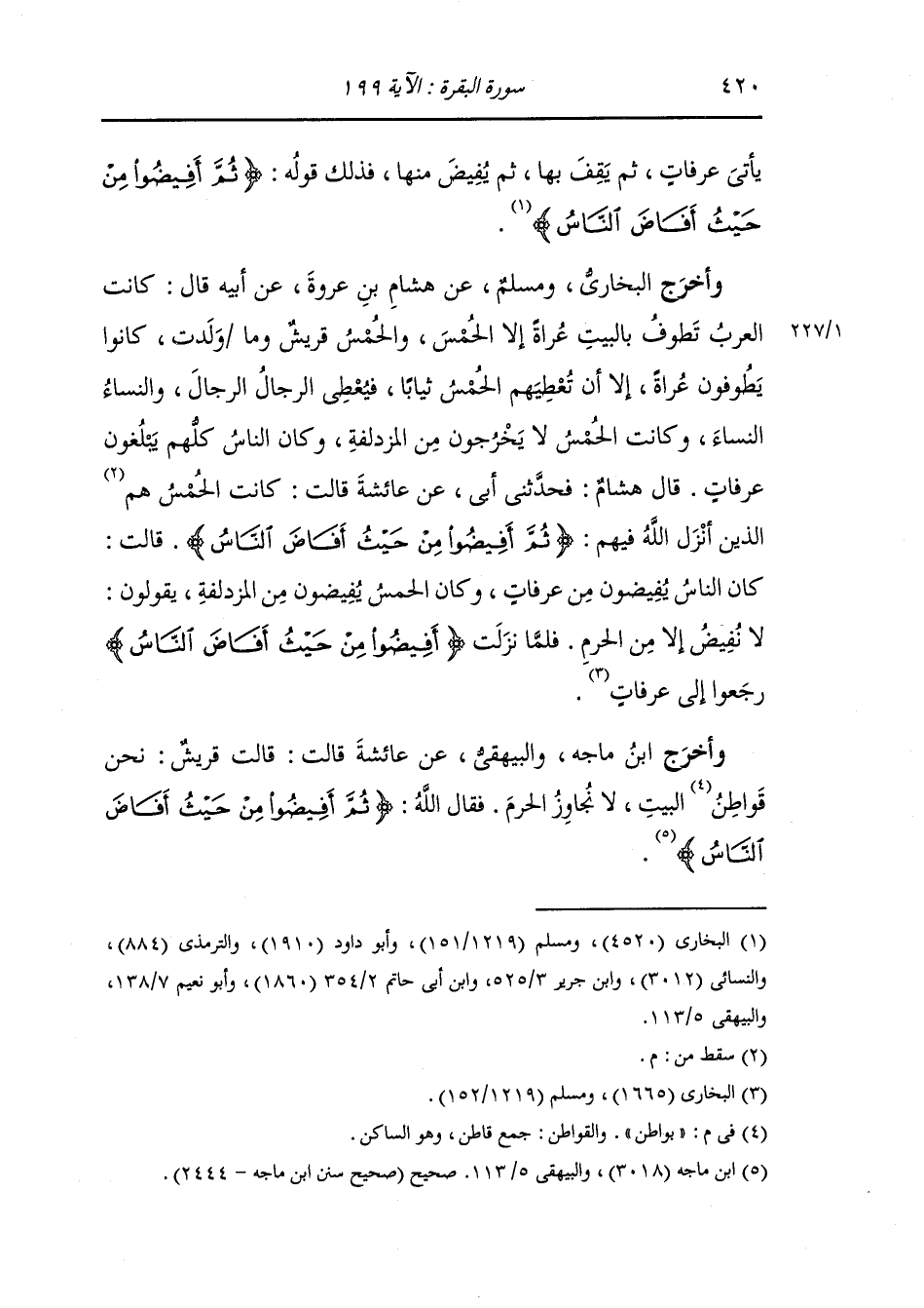 وأخرج ابن ماجة والبيهقي عن عائشة قالت : قالت قريش : نحن قواطن البيت لا نجاوز الحرم فقال الله {ثم أفيضوا من حيث أفاض الناس}