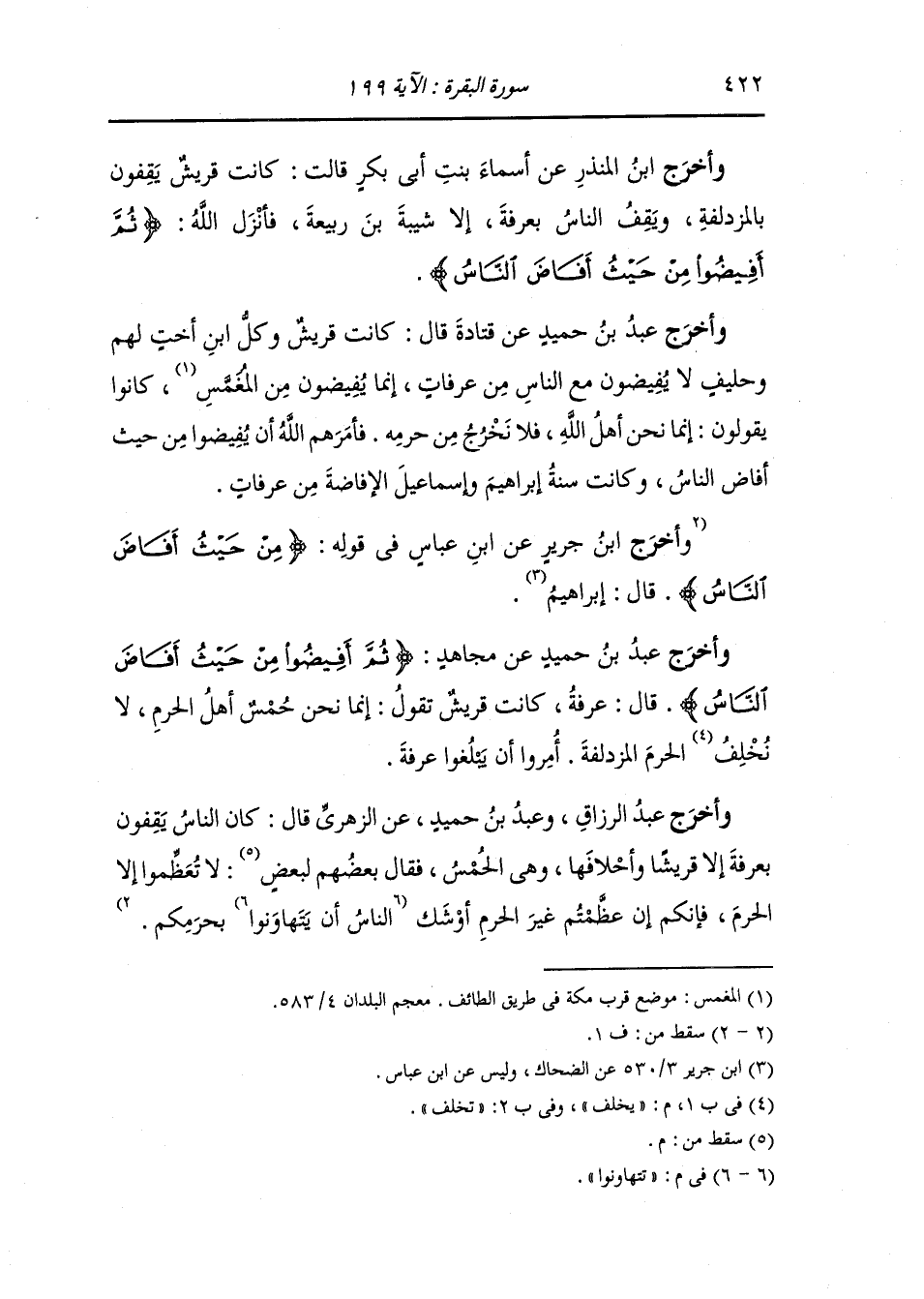 وأخرج عَبد بن حُمَيد عن مجاهد {ثم أفيضوا من حيث أفاض الناس} قال عرفة كانت قريش تقول : إنما نحن حمس أهل الحرم لا يخلف الحرم المزدلفة أمروا أن يبلغوا عرفة.