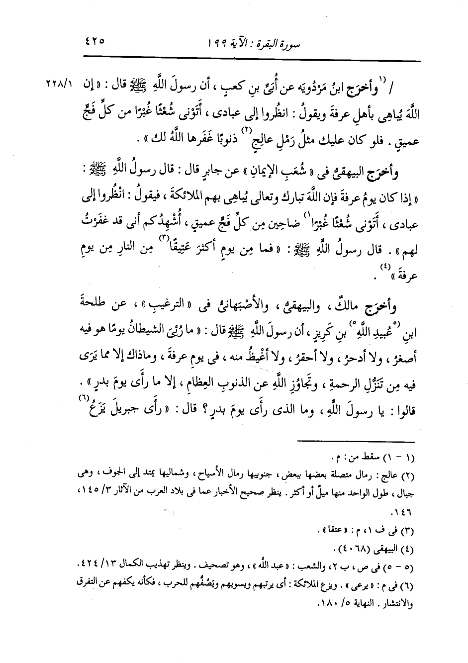 وأخرج ابن مردويه عن أبي بن كعب أن رسول الله صلى الله عليه وسلم قال : إن الله يباهي بأهل عرفة ويقول : انظروا إلى عبادي أتوني شعثا غبرا من كل فج عميق فلو كان عليك مثل رمل عالج ذنوبا غفرها الله لك .