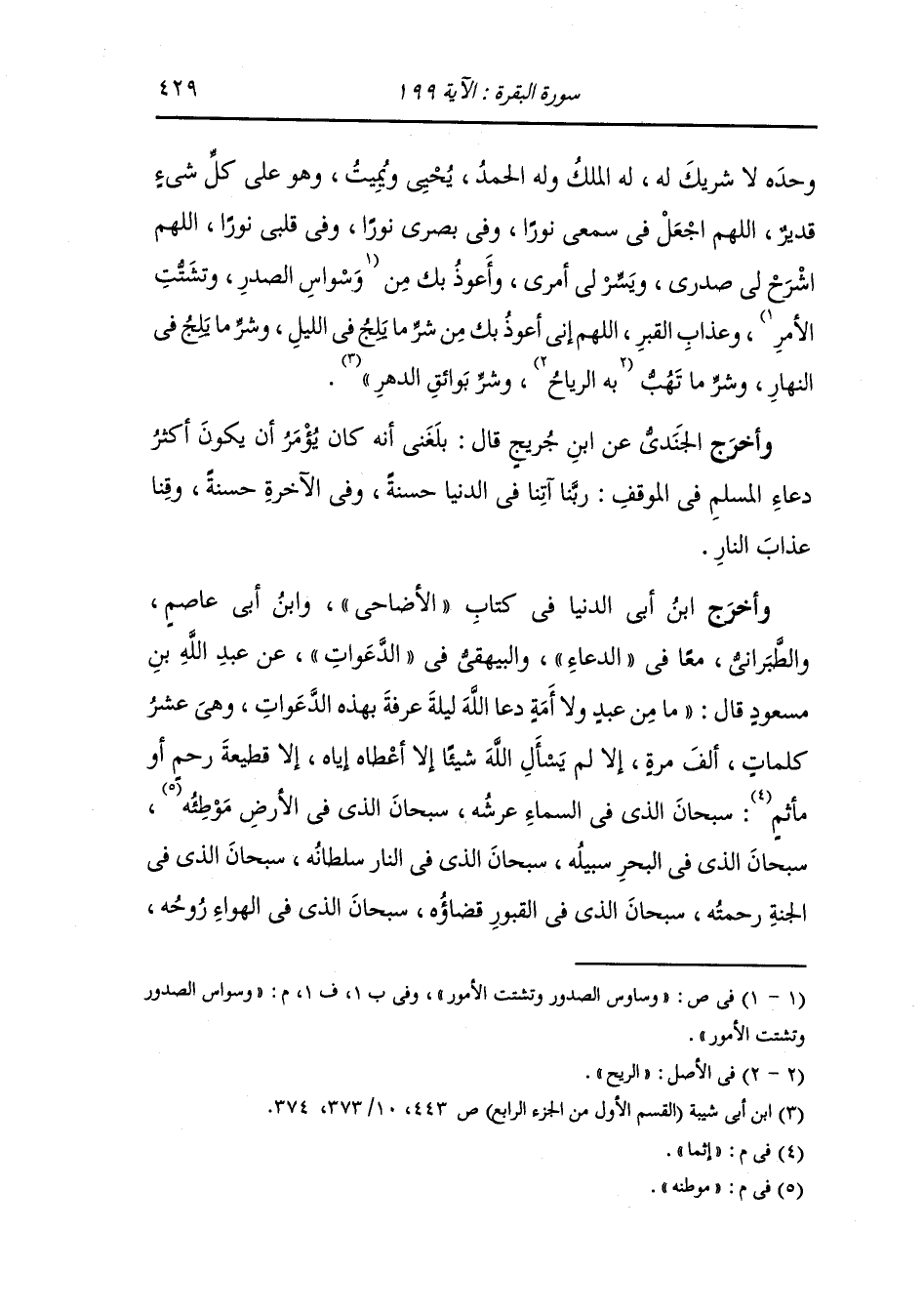وأخرج ابن أبي الدنيا في كتاب الأضاحي ، وَابن أبي عاصم والطبراني معا في الدعاء والبيهقي في الدعوات عن عبد الله بن مسعود قال ما من عبد ولا أمة دعا الله ليلة عرفة بهذه الدعوات - وهي عشر كلمات - ألف مرة إلا ولم يسأل الله شيئا إلا أعطاه إياه إلا قطيعة رحم أوإثما ، سبحان الله الذي في السماء عرشه سبحان الذي في النار سلطانه سبحان الذي في الجنة رحمته سبحان الذي في القبور قضاؤه سبحان الذي في الهواء روحه