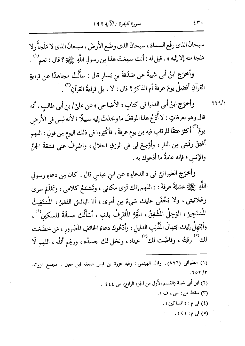 وأخرج الطبراني في الدعاء عن ابن عباس قال : كان من دعاء رسول الله صلى الله عليه وسلم عشية عرفة اللهم إنك ترى مكاني وتسمع كلامي وتعلم سري وعلانيتي ولا يخفى عليك شيء من أمري أنا البائس الفقير المستغيث المستجير الوجل المشفق المقر المعترف بذنوبه أسألك مسألة المساكين وأبتهل إليك إبتهال المذنب الذليل وأدعوك دعاء الخائف المضرور من خضعت لك رقبته وفاضت لك عيناه ونحل لك