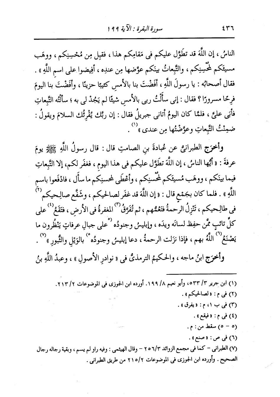 وأخرج الطبراني عن عبادة بن الصامت قال : قال رسول الله صلى الله عليه وسلم يوم عرفة أيها الناس إن الله تطول عليكم في هذا اليوم فغفر لكم إلا التبعات فيما بينكم ووهب مسيئكم لمحسنكم وأعطى محسنكم ما سأل فادفعوا باسم الله فلما كان بجمع قال : إن الله قد غفر لصالحيكم وشفع لصالحيكم في طالحيكم تنزل الرحمة فتعمهم