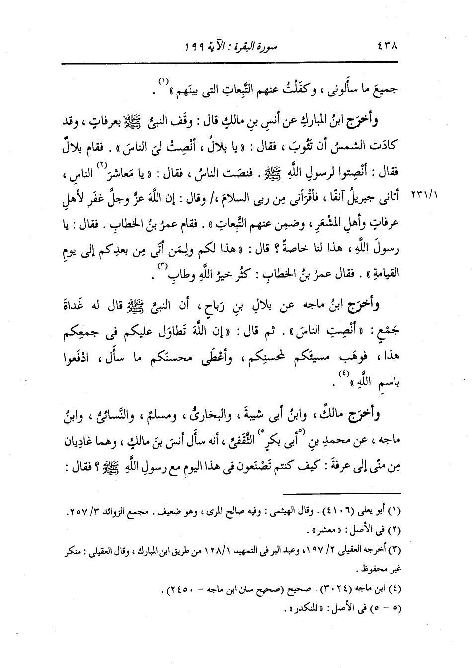 وأخرج ابن المبارك عن أنس بن مالك قال وقف النَّبِيّ صلى الله عليه وسلم بعرفات وقد كادت الشمس أن تؤوب فقال : يا بلال أنصت لي الناس ، فقام بلال فقال : انصتوا لرسول الله صلى الله عليه وسلم ، فنصت الناس فقال : يا معاشر الناس أتاني جبريل آنفا فأقرأني من ربي السلام وقال : إن الله عز وجل غفر لأهل عرفات وأهل المشعر وضمن عنهم التبعات ، فقام عمر بن الخطاب فقال : يا رسول الله هذا لنا خاصة قال : هذا لكم ولمن أتى من بعدكم إلى يوم القيامة ، فقال عمر بن الخطاب : كثر خير الله وطاب.