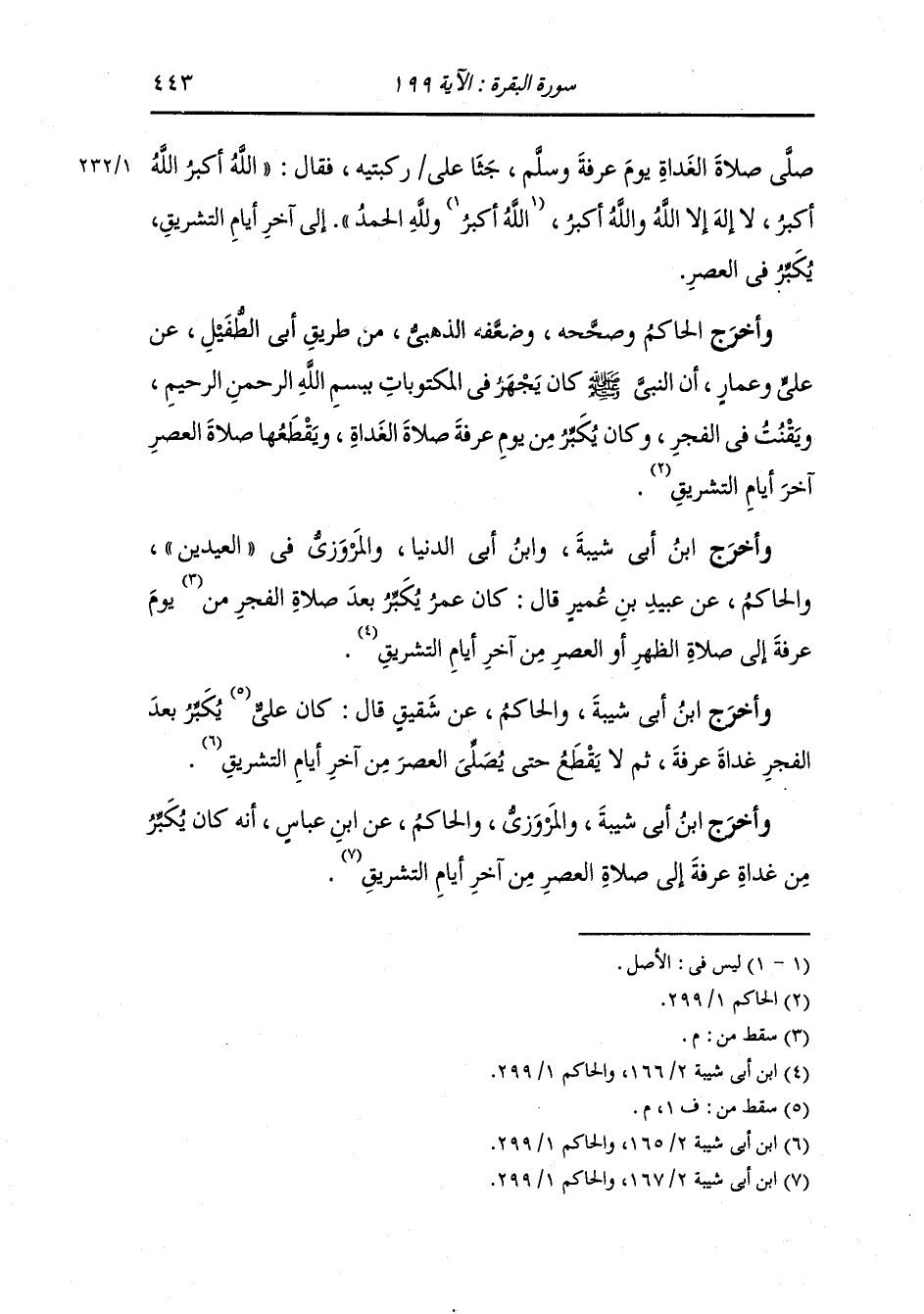 وأخرج ابن أبي شيبة والمروزي والحاكم عن ابن عباس : أنه كان يكبر من غداة عرفة إلى صلاة العصر من آخر أيام التشريق