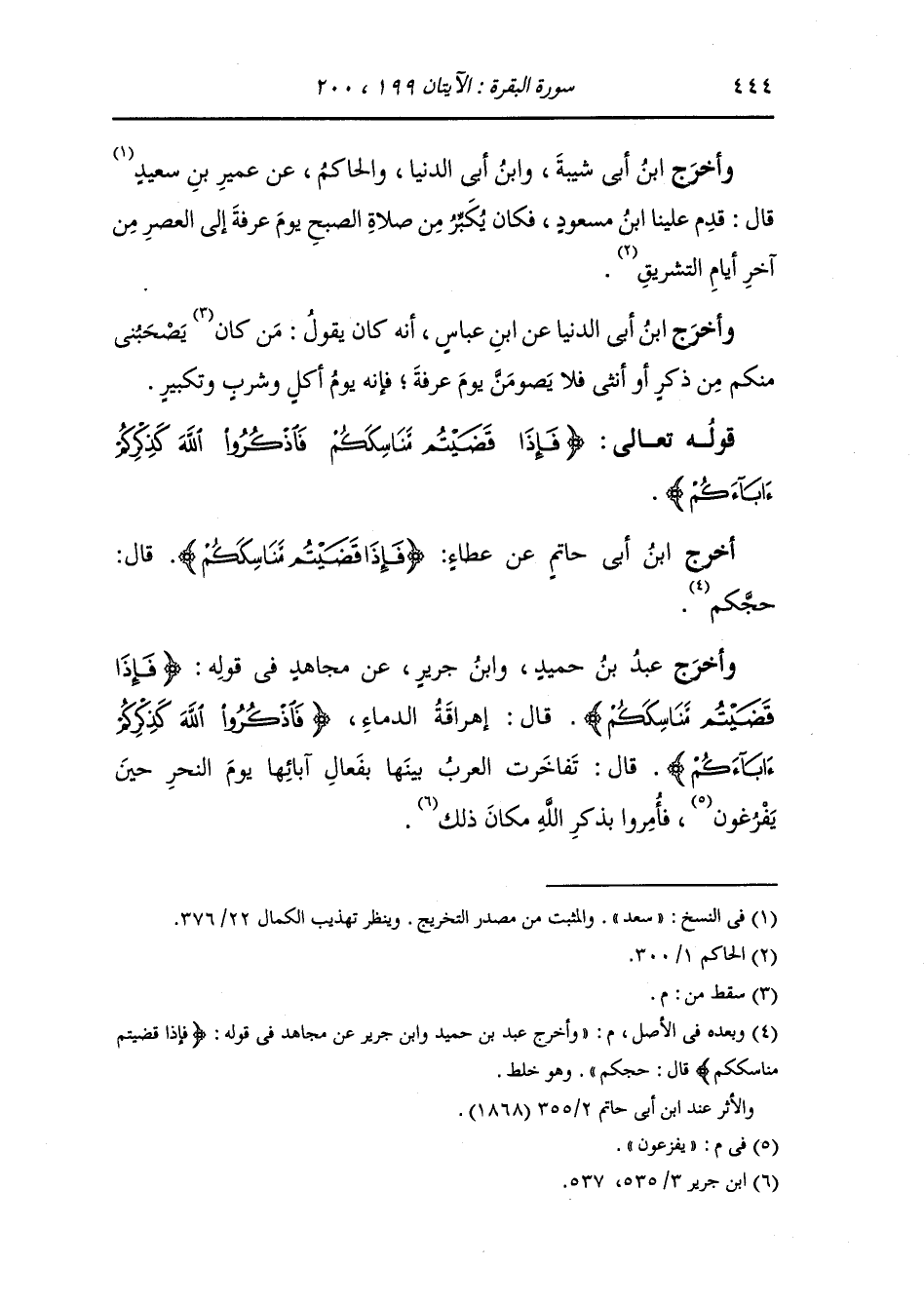 وأخرج عَبد بن حُمَيد ، وَابن جَرِير عن مجاهد في قوله {فإذا قضيتم مناسككم} قال : اهراقه الدماء {فاذكروا الله كذكركم آباءكم} قال : تفاخر العرب بينها بفعال آبائها يوم النحر حين يفزعون فأمروا بذكر الله مكان ذلك
