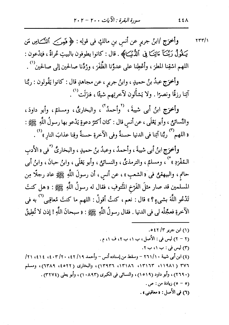 وأخرج ابن أبي شيبة والبخاري ومسلم وأبو داود والنسائي وأبو يعلى عن أنس قال : كان أكثر دعوة يدعو بها رسول الله صلى الله عليه وسلم : اللهم ربنا آتنا في الدنيا حسنة وفي الآخرة حسنة وقنا عذاب النار.