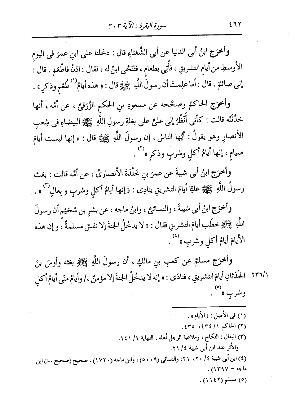 وأخرج الحاكم وصححه عن مسعود بن الحكم الزرقي عن أمه أنها حدثته قالت كأني أنظر إلى علي على بغلة رسول الله صلى الله عليه وسلم البيضاء في شعب الأنصار وهو يقول : أيها الناس إن رسول الله صلى الله عليه وسلم قال : إنها ليست أيام صيام إنها أيام أكل وشرب وذكر.