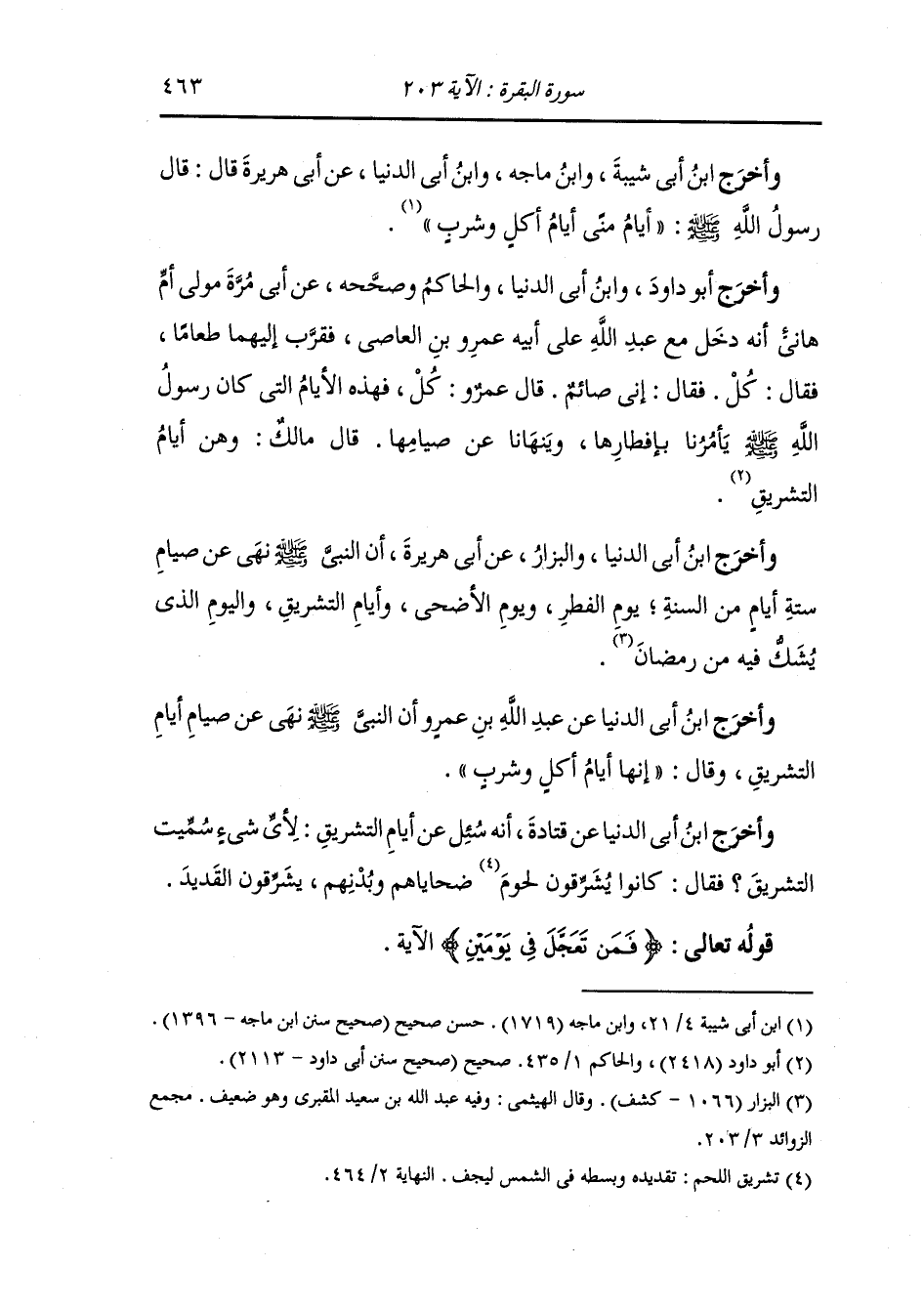 وأخرج أبو داود ، وَابن أبي الدنيا والحاكم وصححه عن أبي مرة مولى أم هانى ء أنه دخل مع عبد الله على أبيه عمرو بن العاص فقرب إليهما ظعاما فقال : كل فقال : إني صائم ، قال عمرو : كل فهذه الأيام التي كان رسول الله صلى الله عليه وسلم يأمرنا بإفطارها وينهانا عن صيامها ، قال مالك : وهن أيام التشريق.