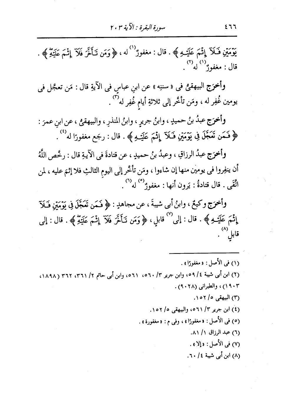 وأخرج البيهقي في "سُنَنِه" عن ابن عباس في الآية قال : من تعجل في يومين غفر له ومن تأخر إلى ثلاثة أيام غفر له.